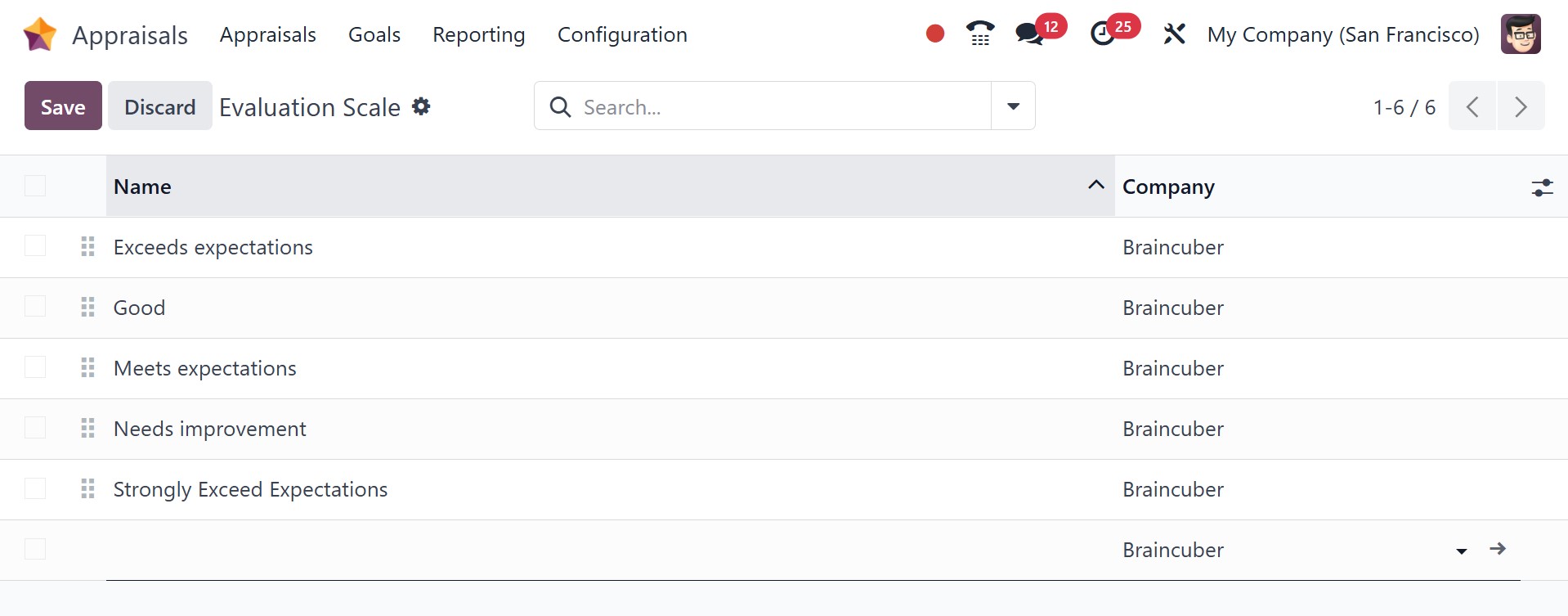 The Configuration feature of Odoo 18 makes managing all company needs easy. You can adjust the evaluation scale and settings on the Odoo 18 Appraisal Configuration page. Let's have a peek at each menu below.