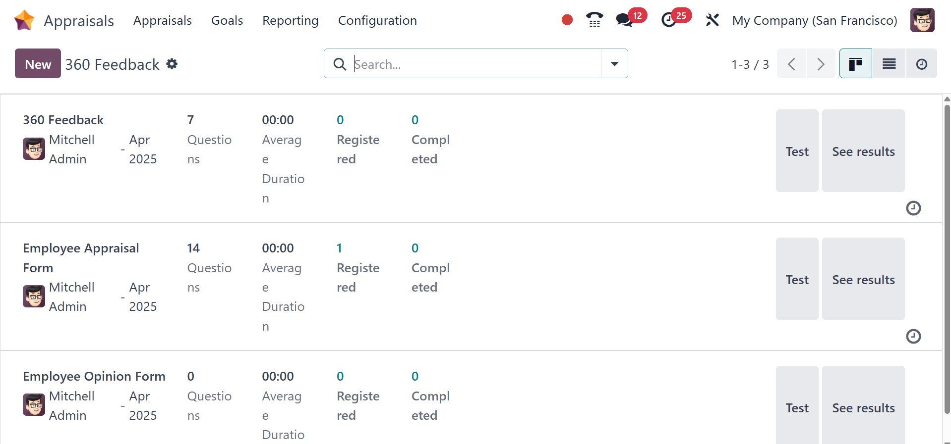 In the 360 Feedback, we can see details about each survey, including its average duration, questions, registered, completed, and more. The Surveys window can also be used to plan activities, test, share, start a live session, and view results. You can describe a company's brand-new employee survey by choosing the New icon.