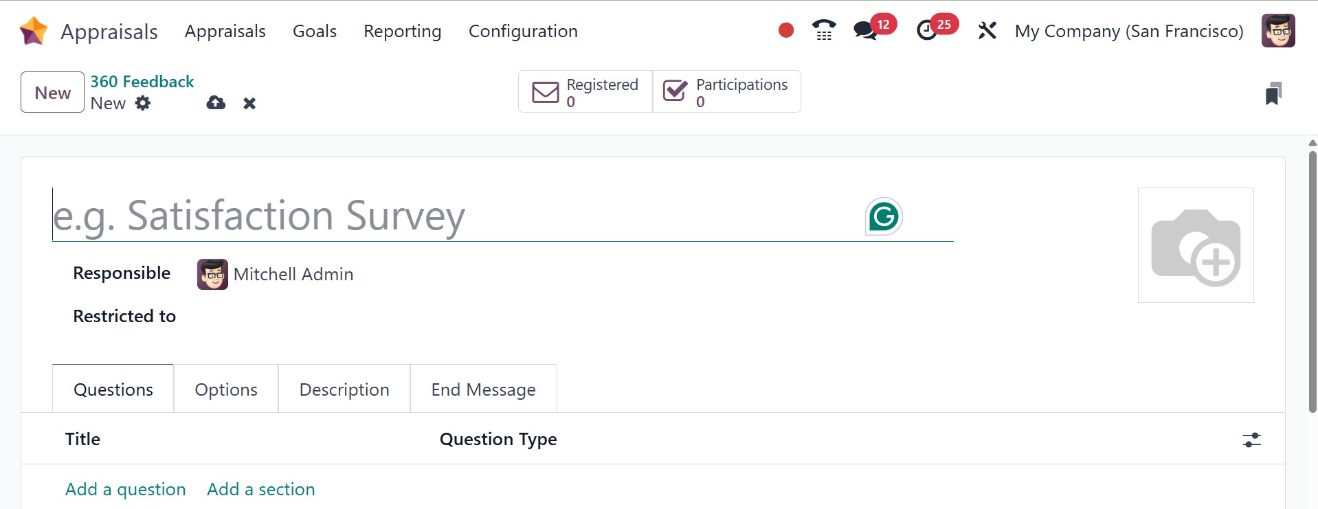 - Responsible: the employee responsible for the survey, including the month and year they were given that designation. You can also restrict it to a particular person, using the restricted to option. Below that, you have the questions, options, description, and end message tabs as well.