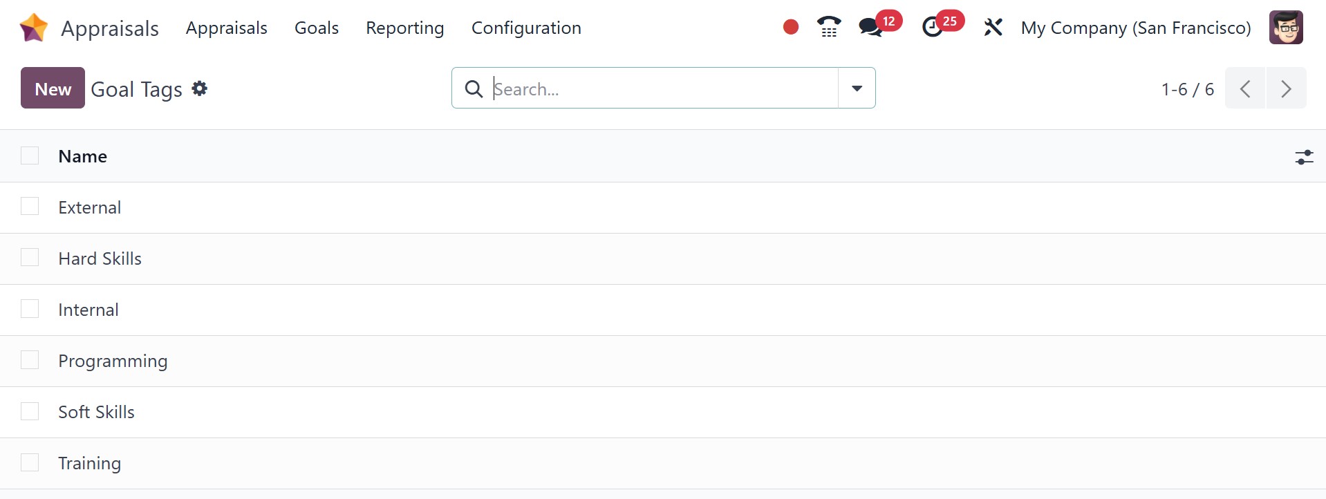 Tags used in the Goal are generated in the Tags menu, which is part of the Configuration menu. Click the New button to add a new tag.