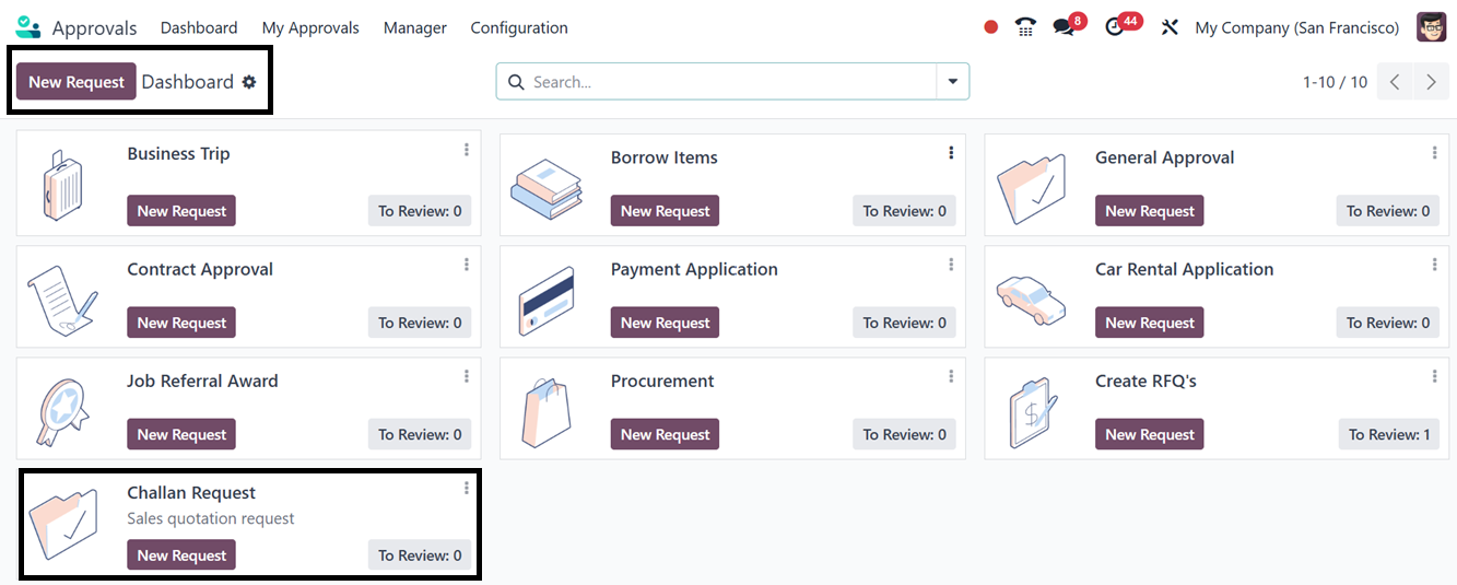 types such as Business Trip Requests, Purchase Requests, Equipment