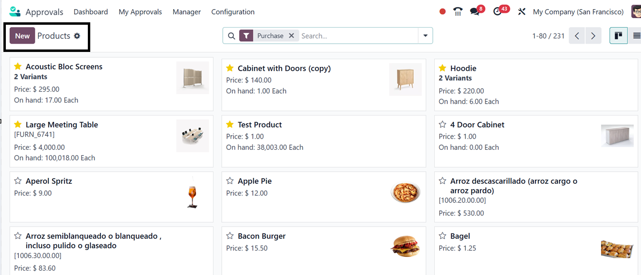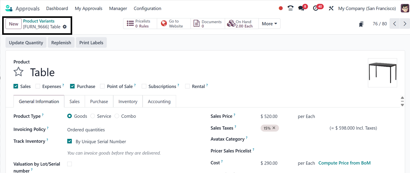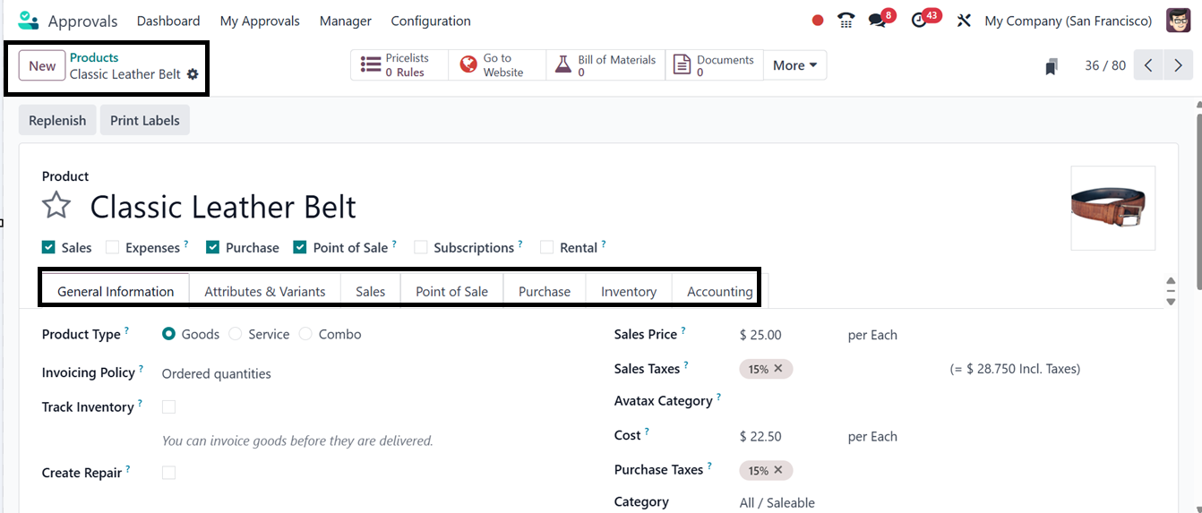 Odoo 18's Approval module uses the 'Product' menu to track