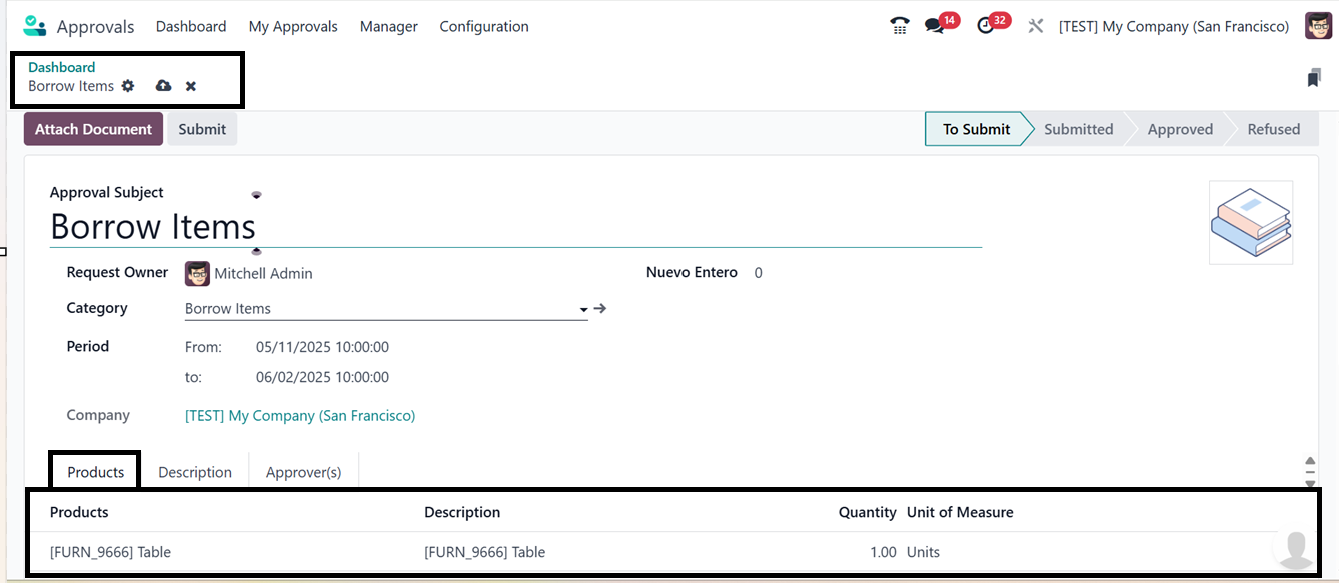 Here, You can see a demonstration approval request for borrowing a