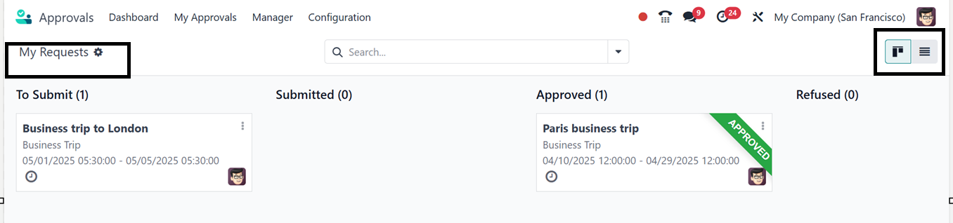 The 'My Approvals' option in the Approvals module of Odoo 18