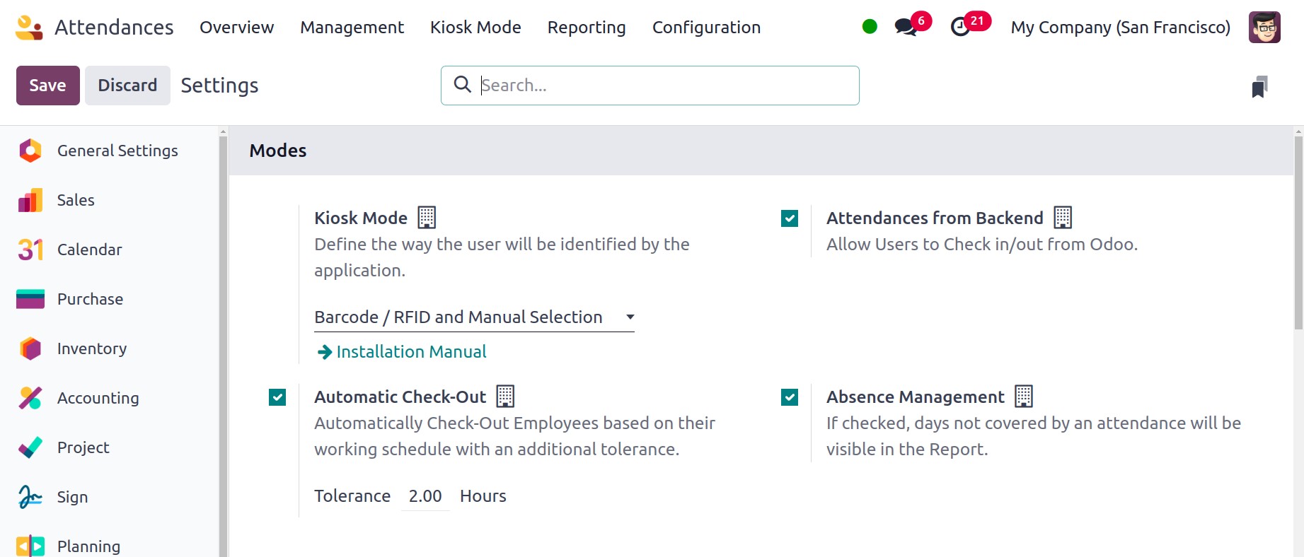 Odoo 18 Attendance's Configuration functionality. A Settings window