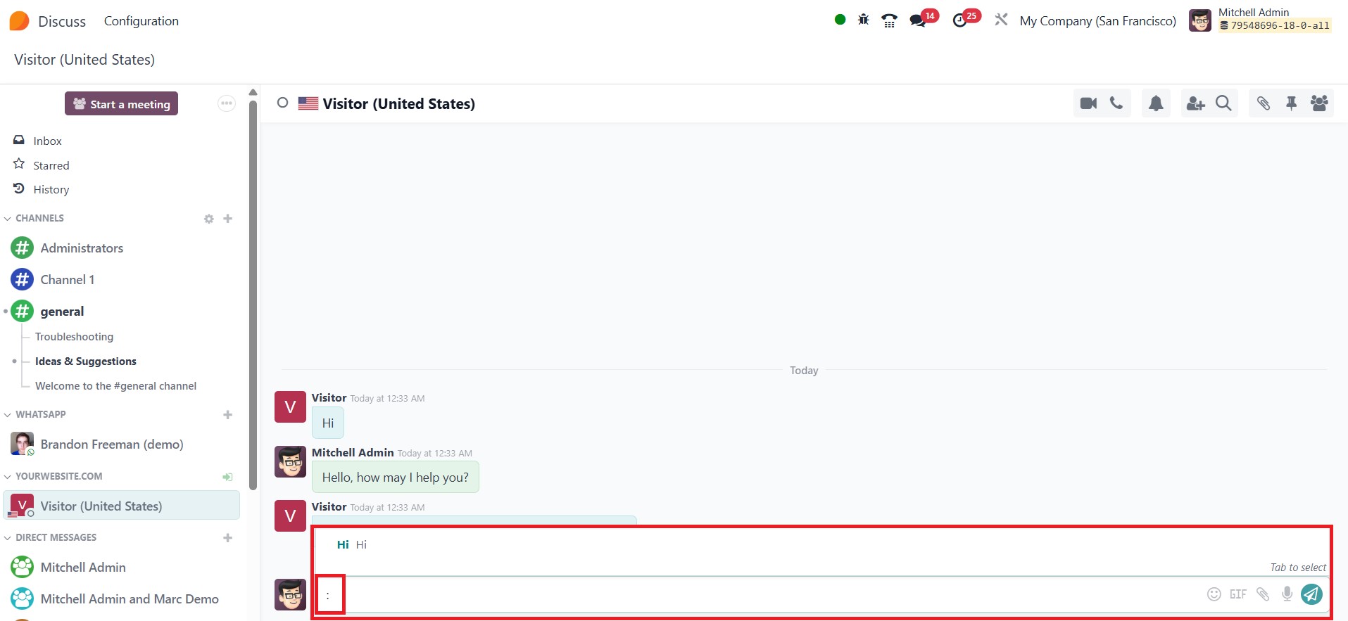 in any chat window, such as in the Discuss app, Live Chat