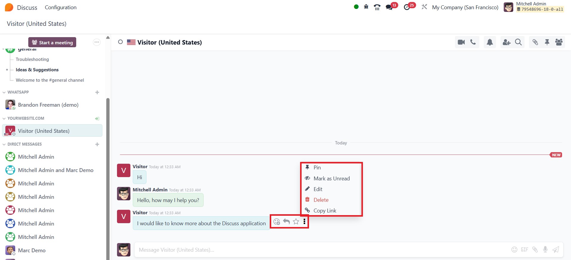 In Odoo 18 Enterprise Edition, hovering over a direct message within