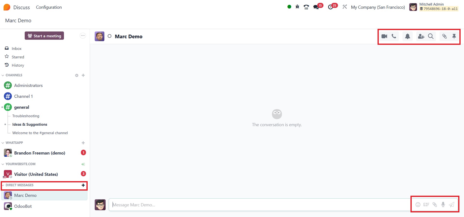 To start a direct message in the Discuss module of Odoo 18 Enterprise