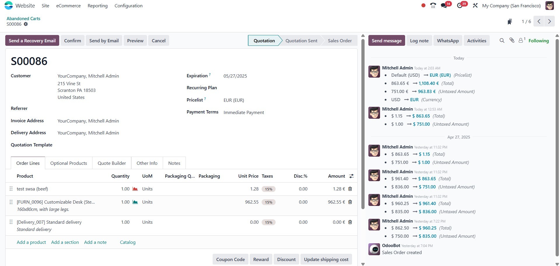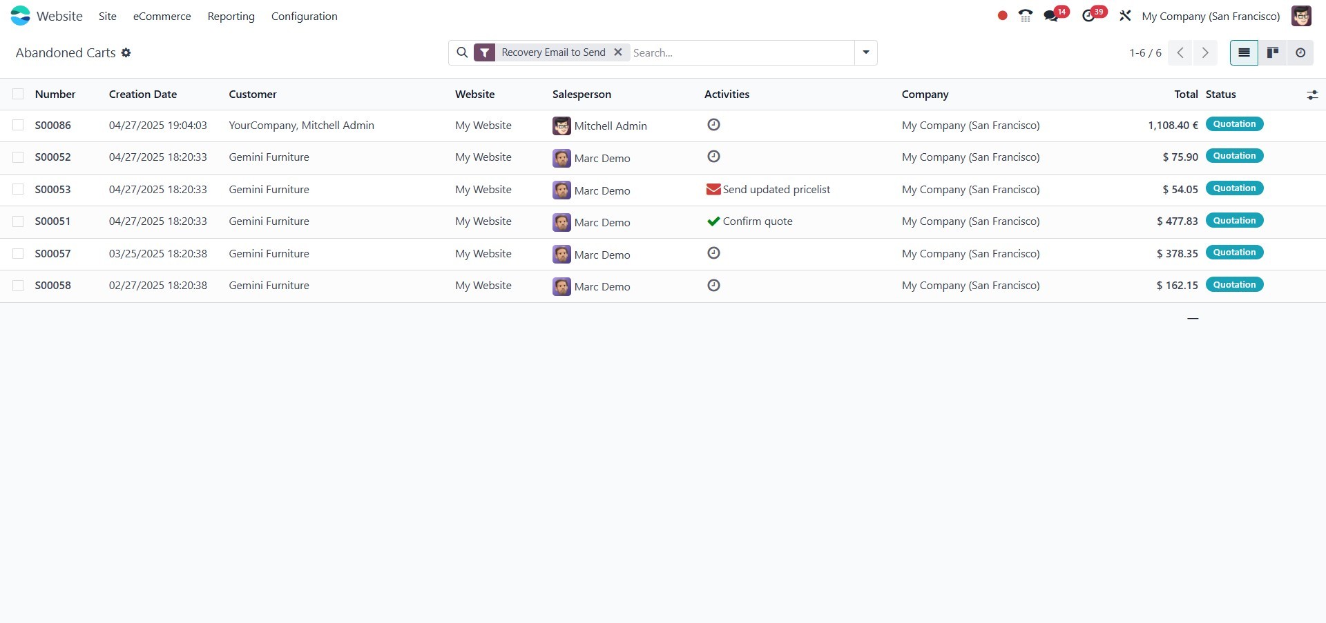 Similar to the Abandoned Carts feature in Odoo 17, Odoo 18 tracks and