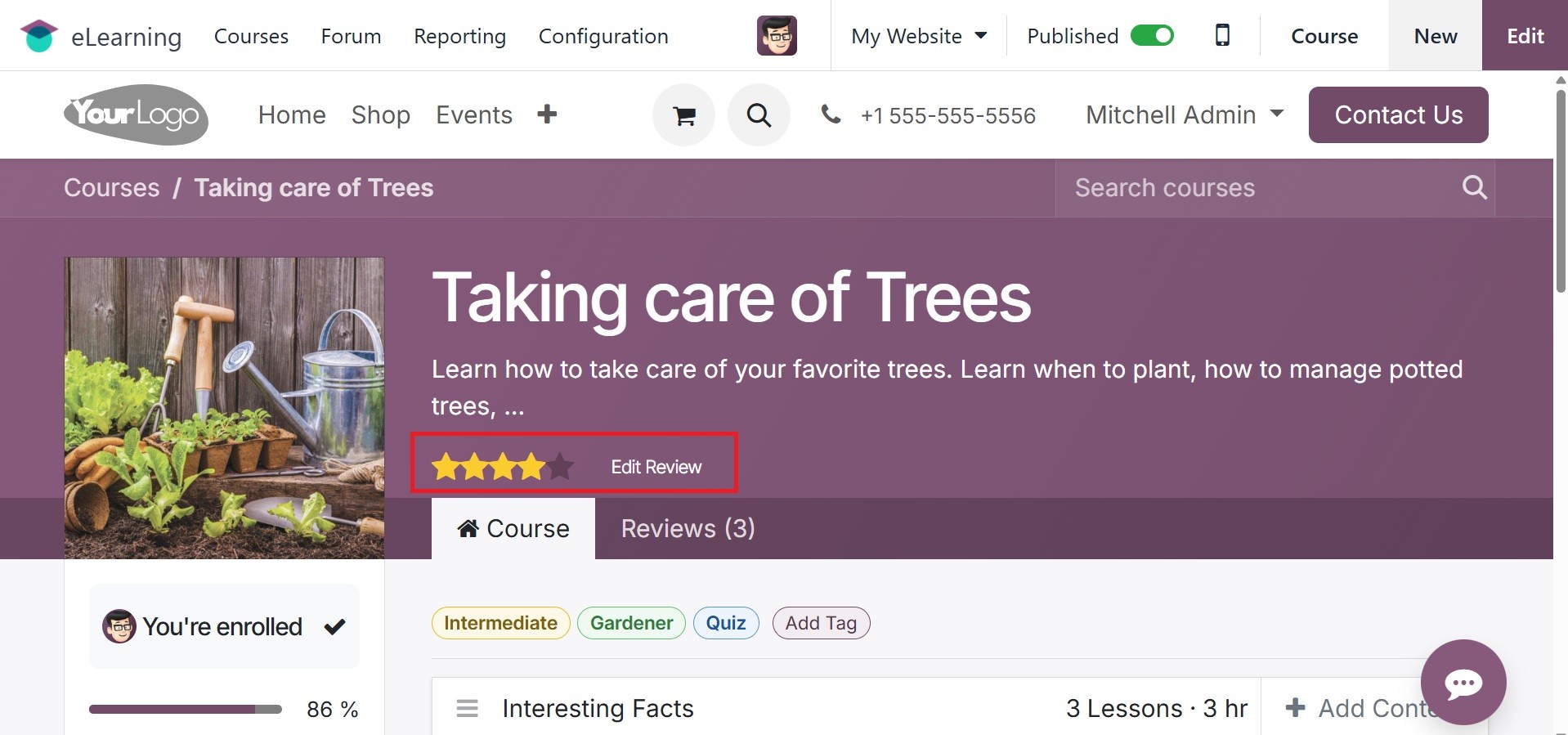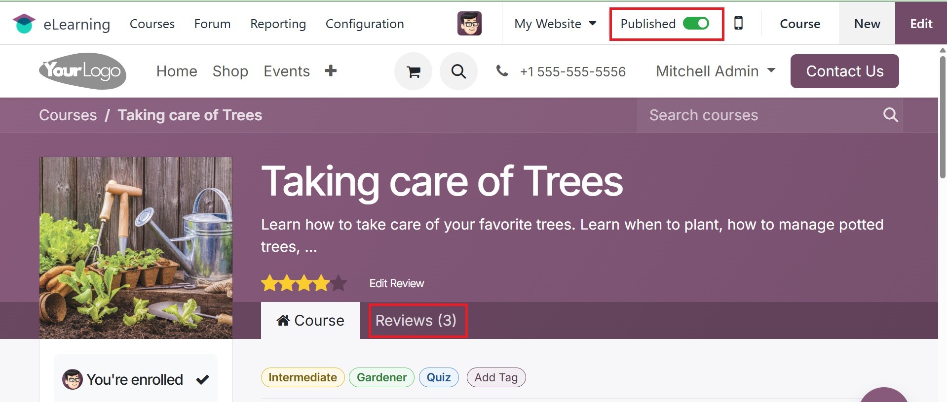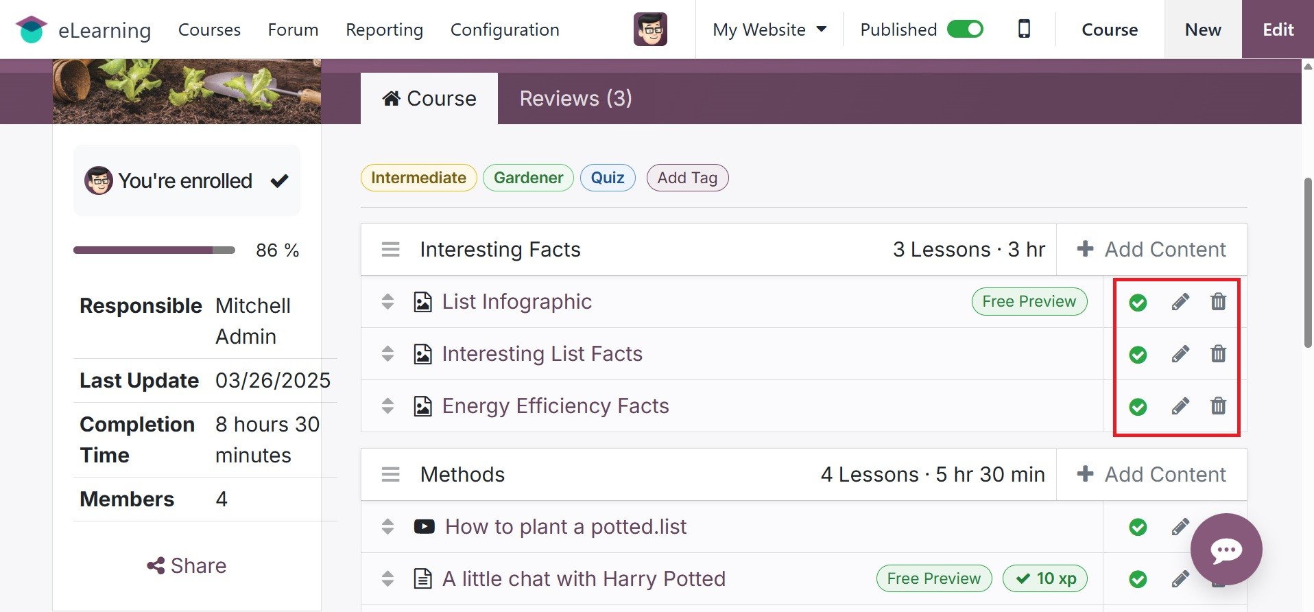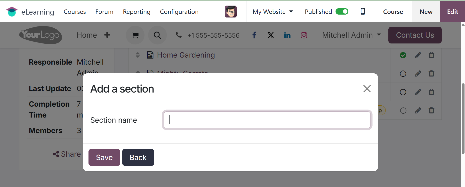 course's contents are entered