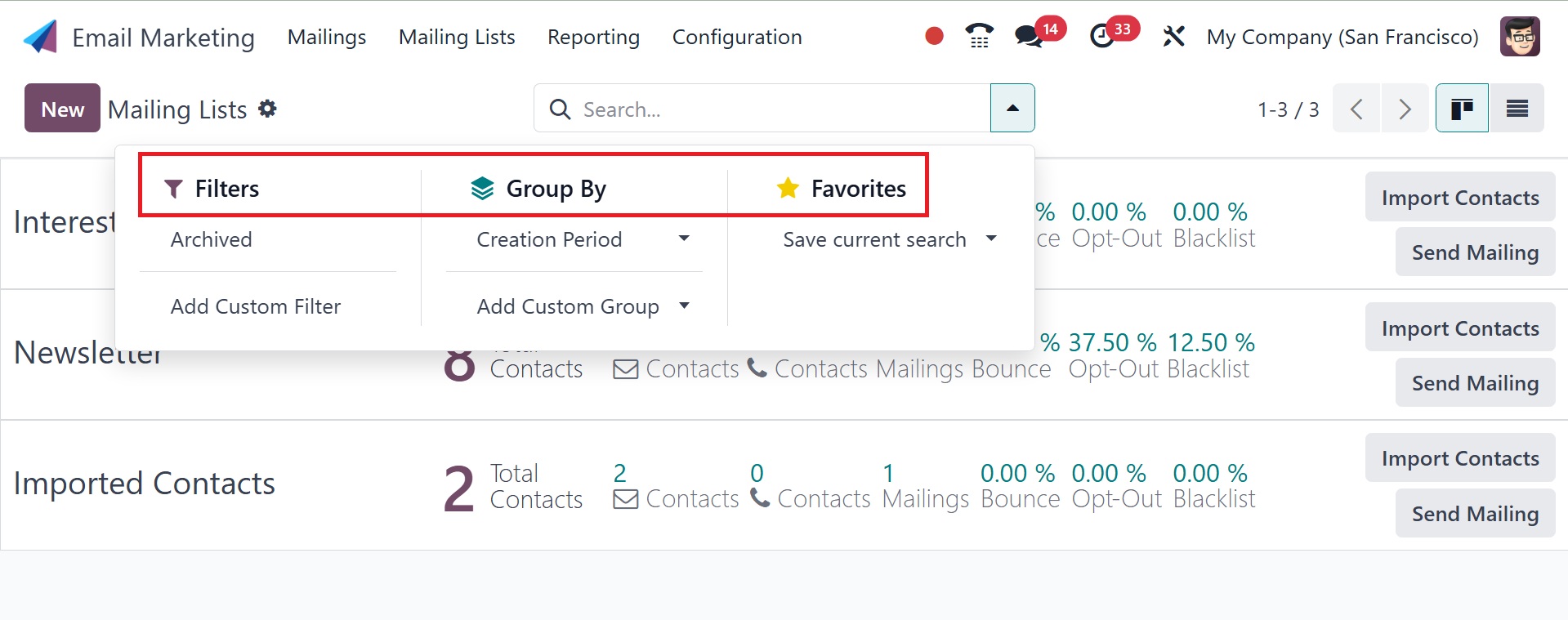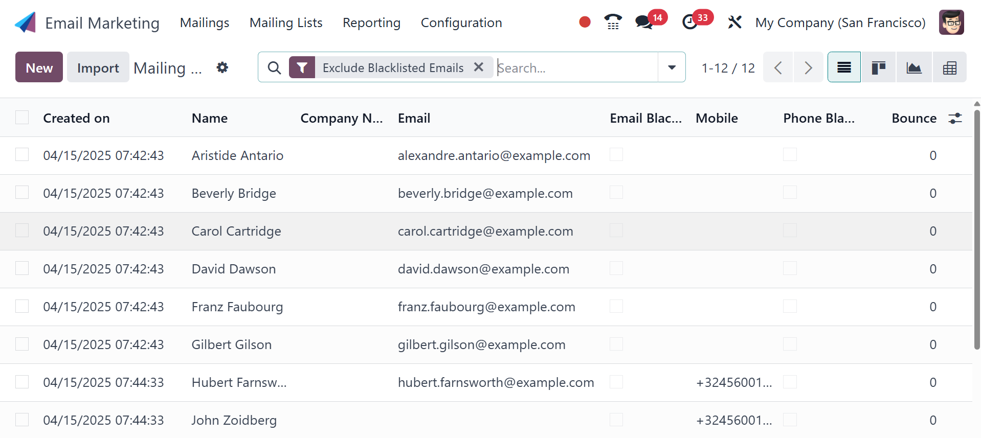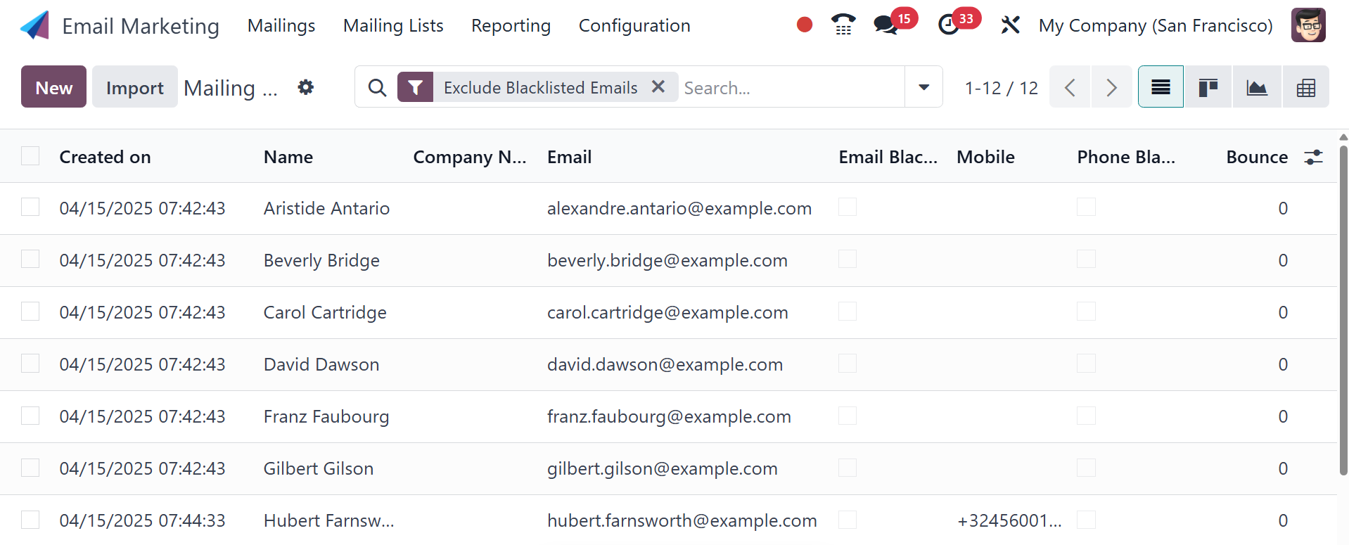 Odoo Email Marketing module's "Import Contacts" option. Building