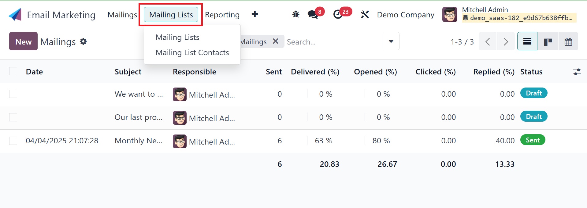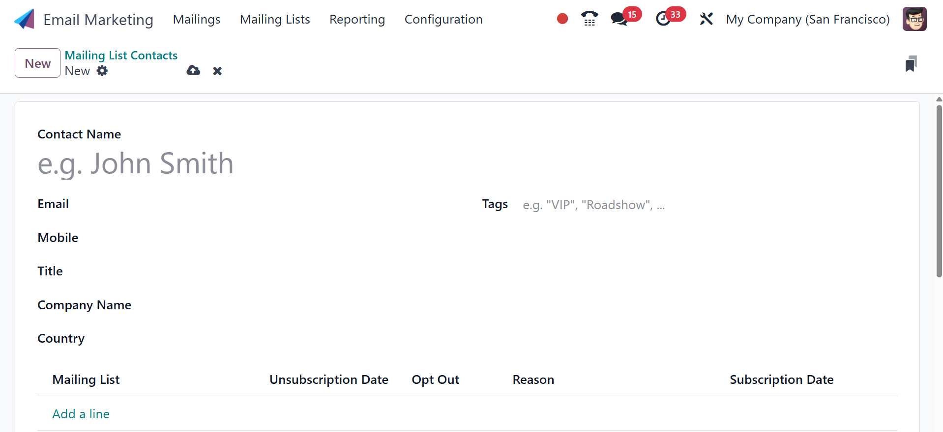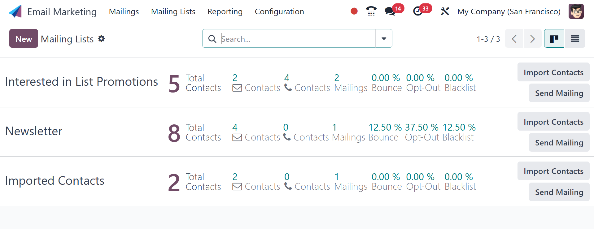 Odoo Email Marketing module's "Import Contacts" option. Building
