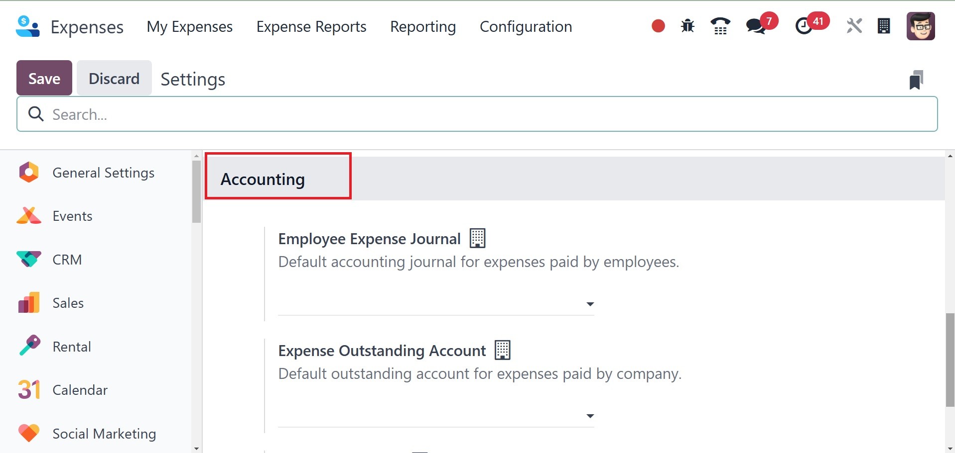 Payment section. The Accounting options in Odoo Expenses have the