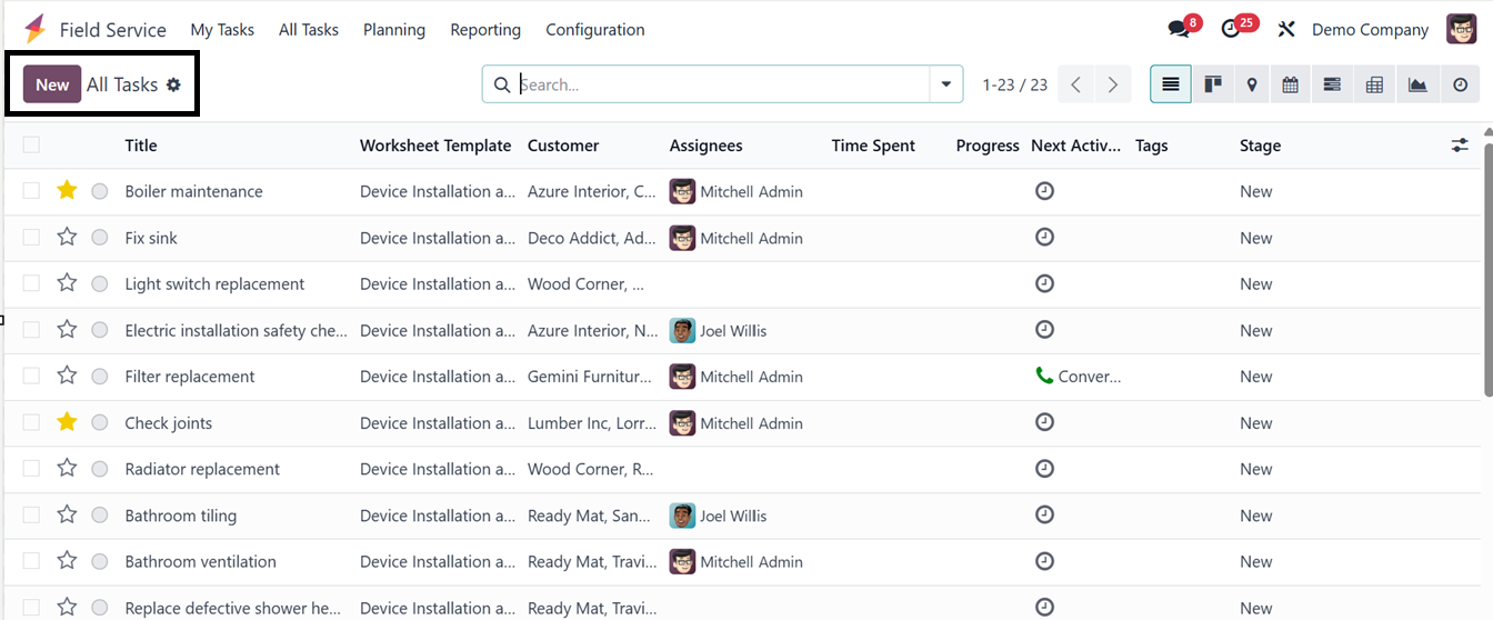 The "All Tasks" menu in the Odoo 18 Field Service module provides a