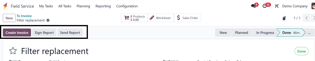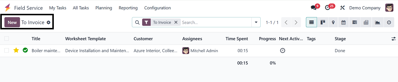 The “To Invoice” platform in Odoo Field Service displays all finished