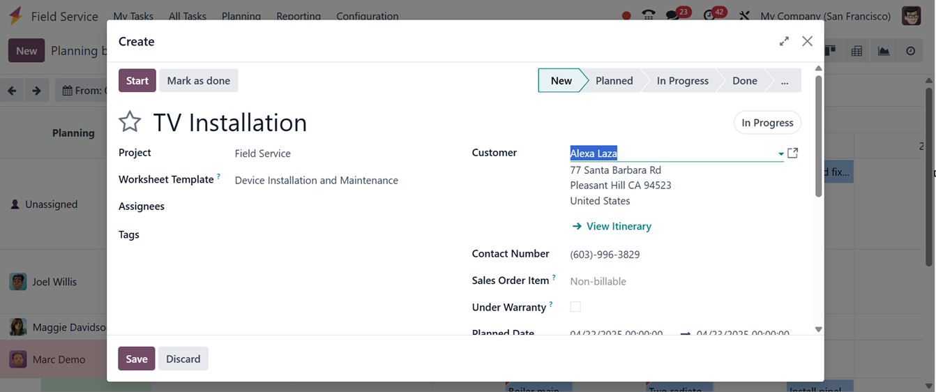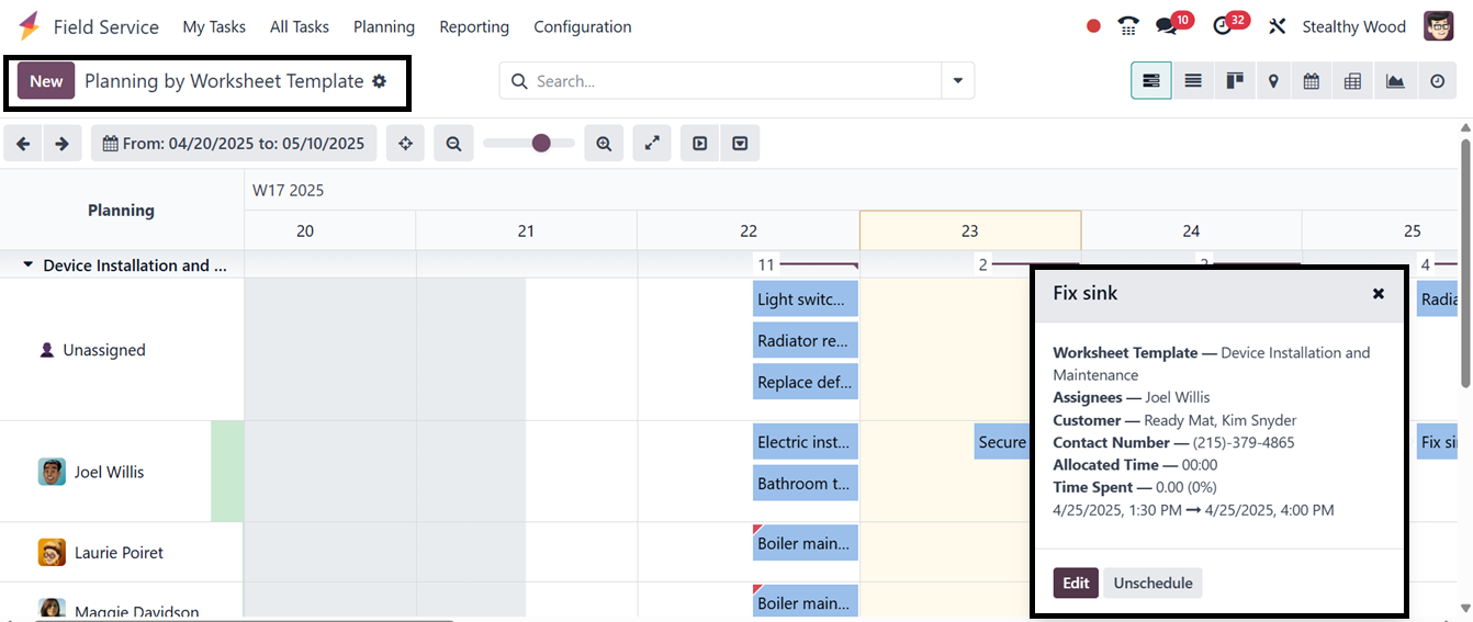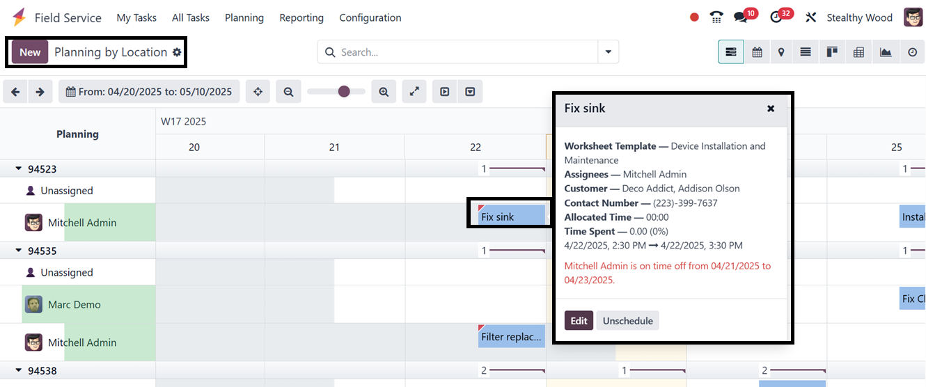 available in the Odoo 18 Field Service Module. The "Planning" menu