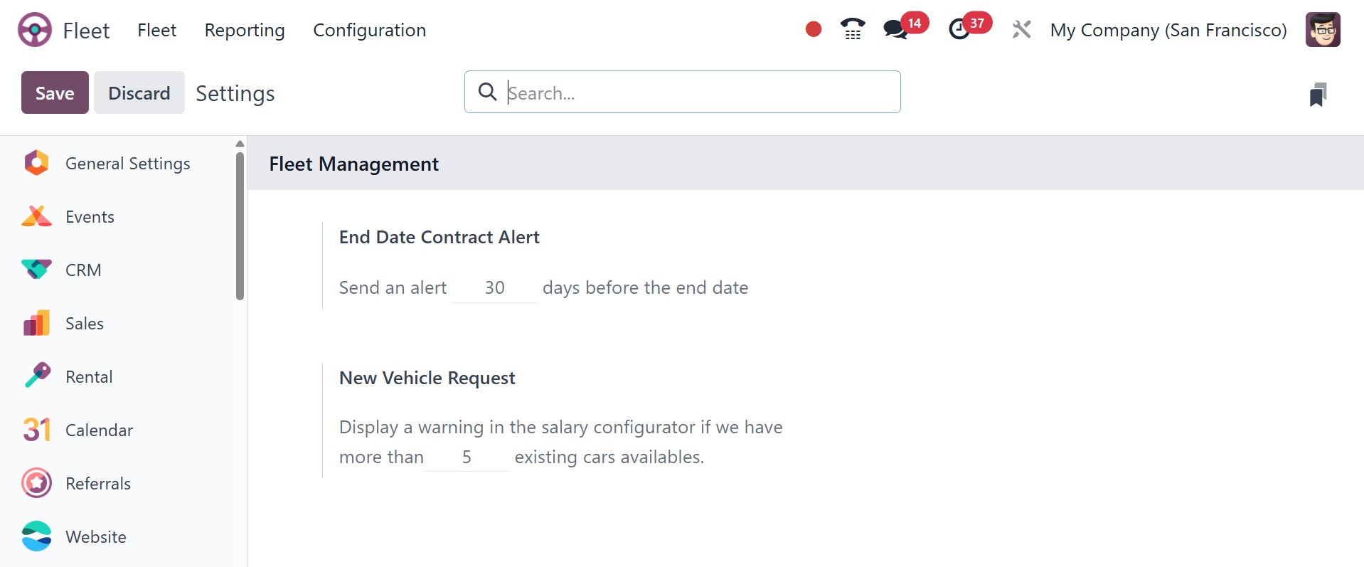 alert in the Odoo Fleet management module's Settings window. Below is a screenshot