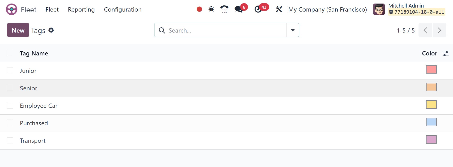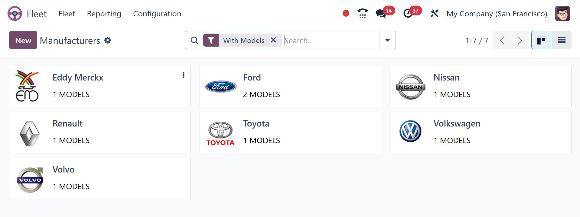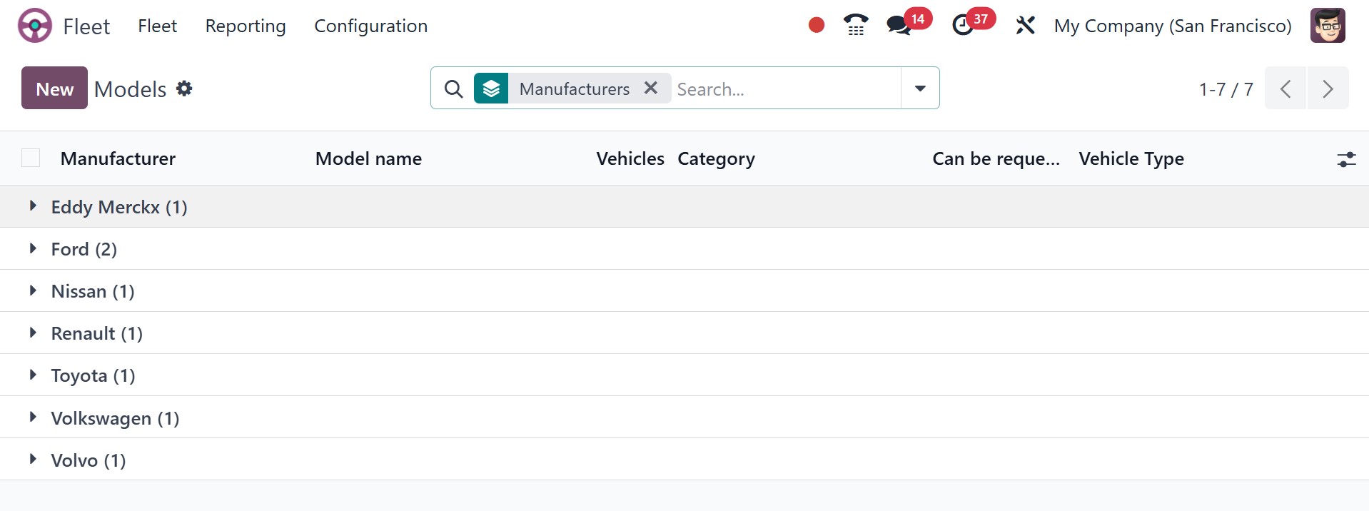 The Odoo Fleet management system's Vehicle Models window is intended to show you