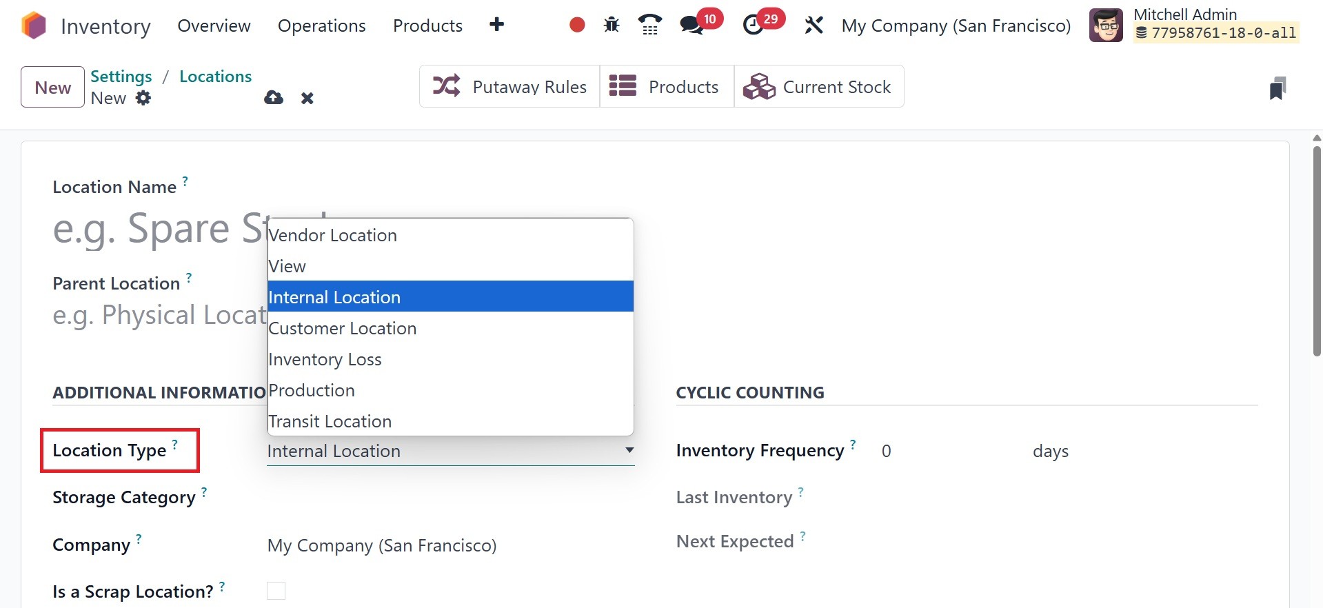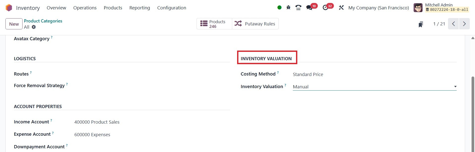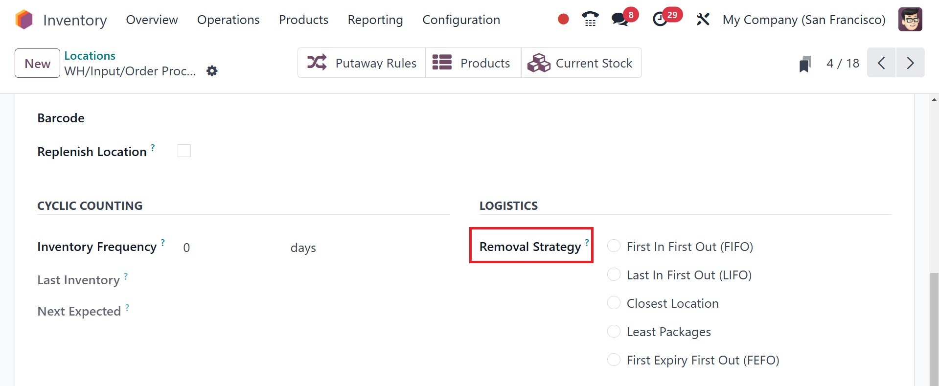 Odoo 18 Inventory module. To