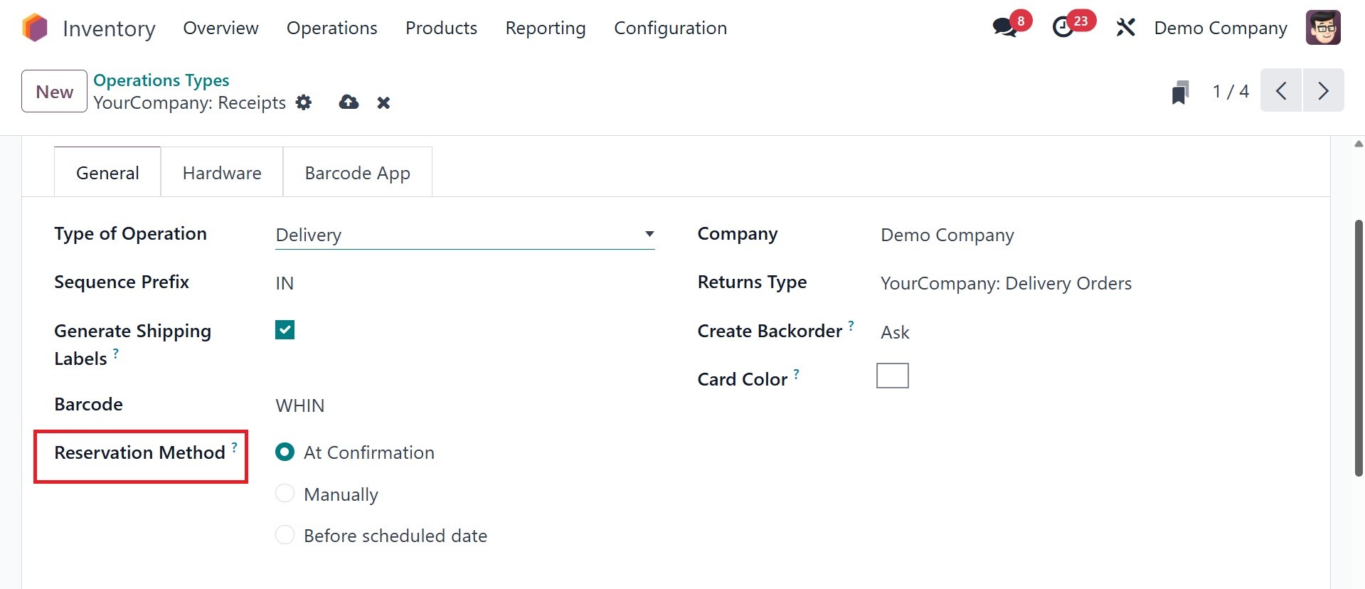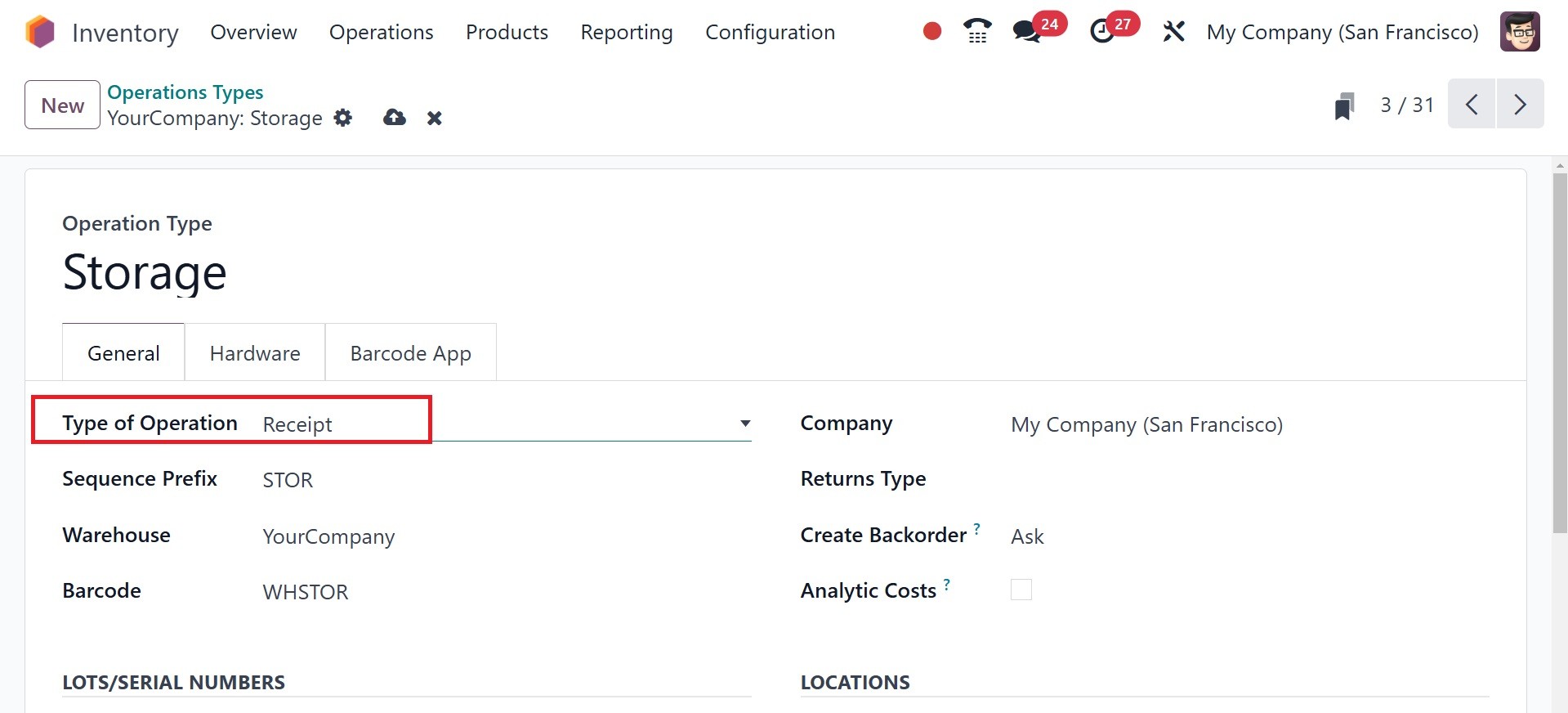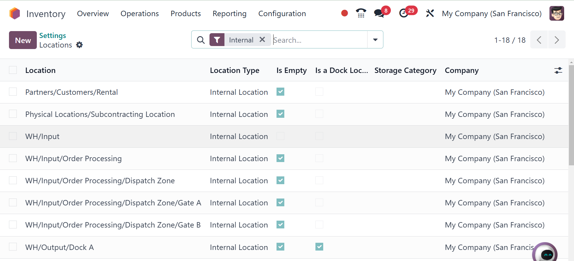 Odoo 18 Inventory module. To