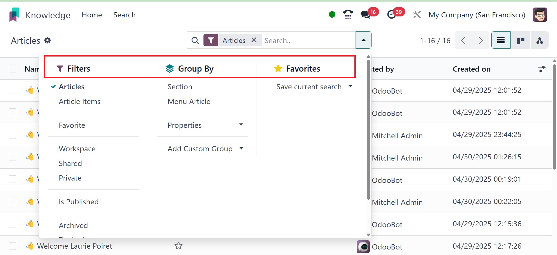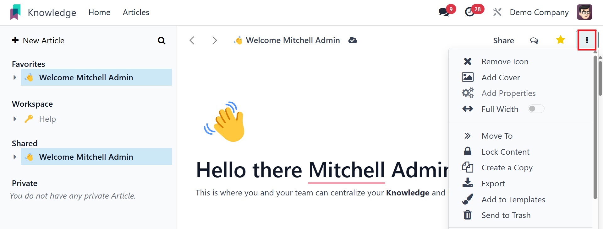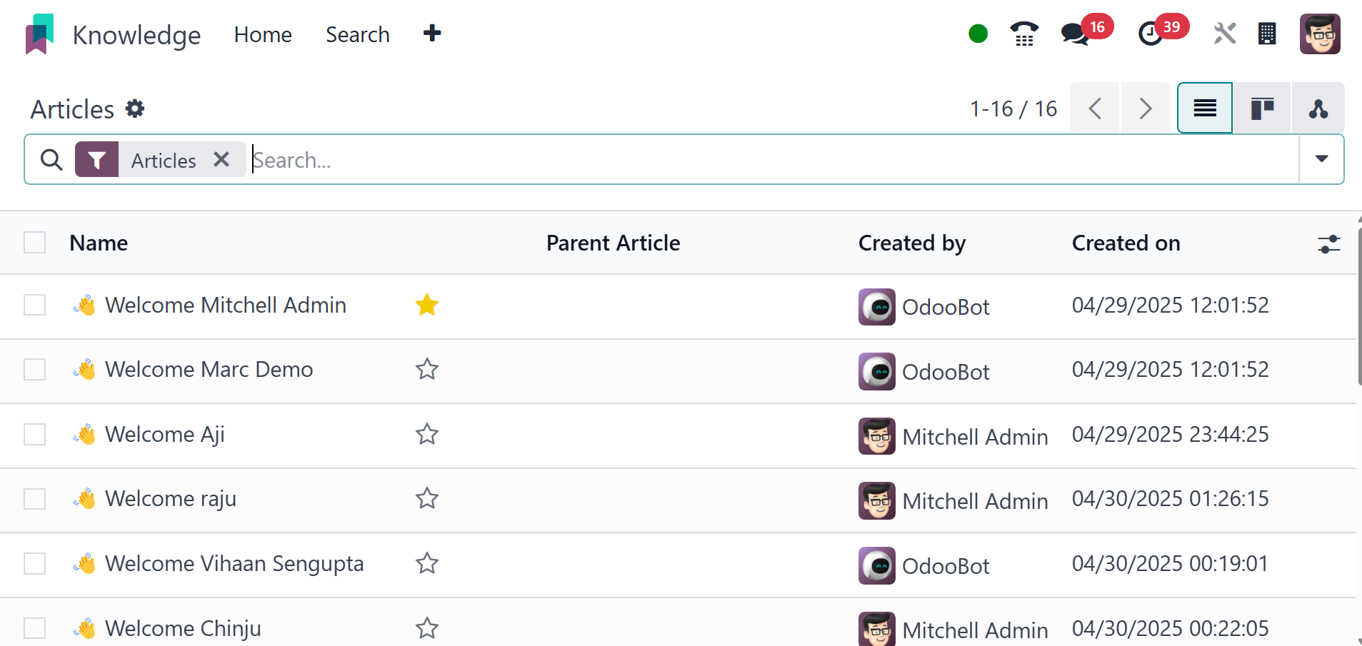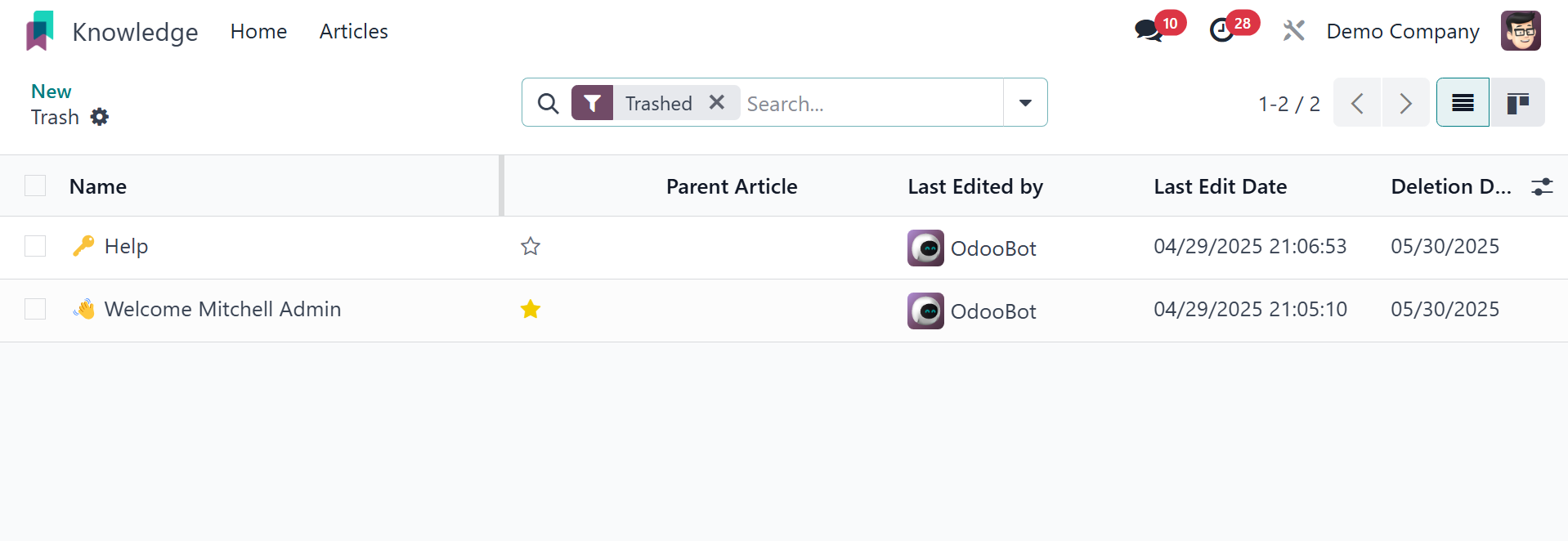 Name, Parent Article, Last Edited By, Last Edit Date, and Deletion