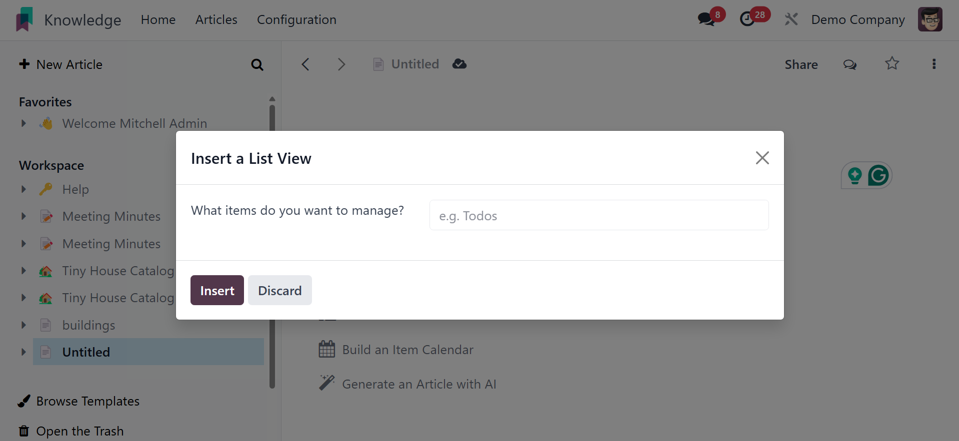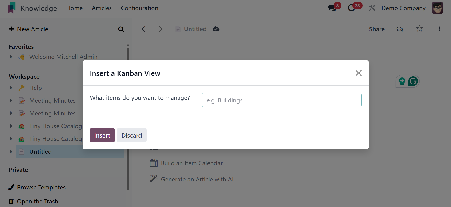 Clicking the Build an Item Kanban button will bring up a dialog box