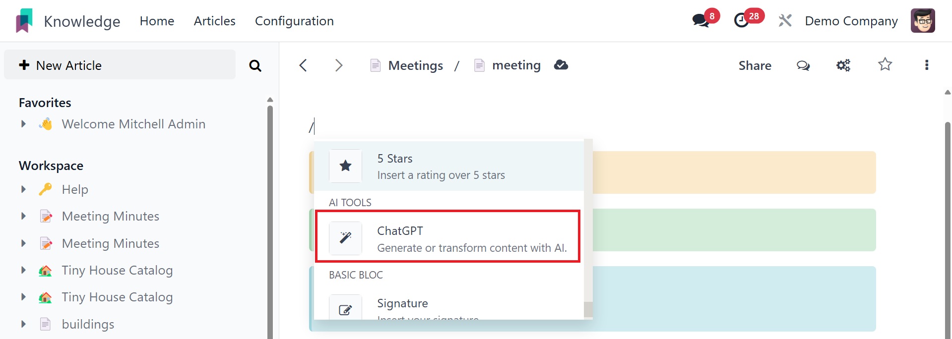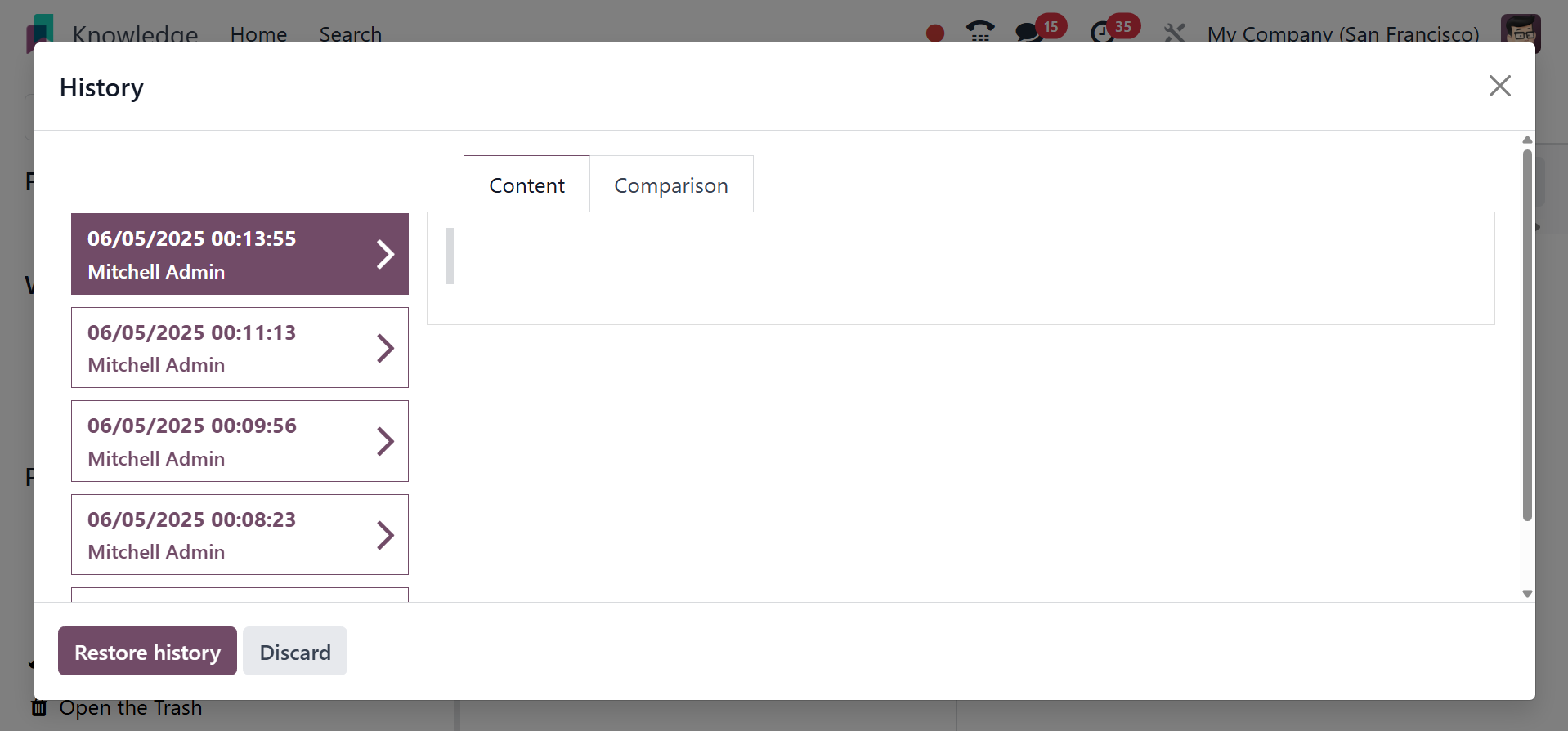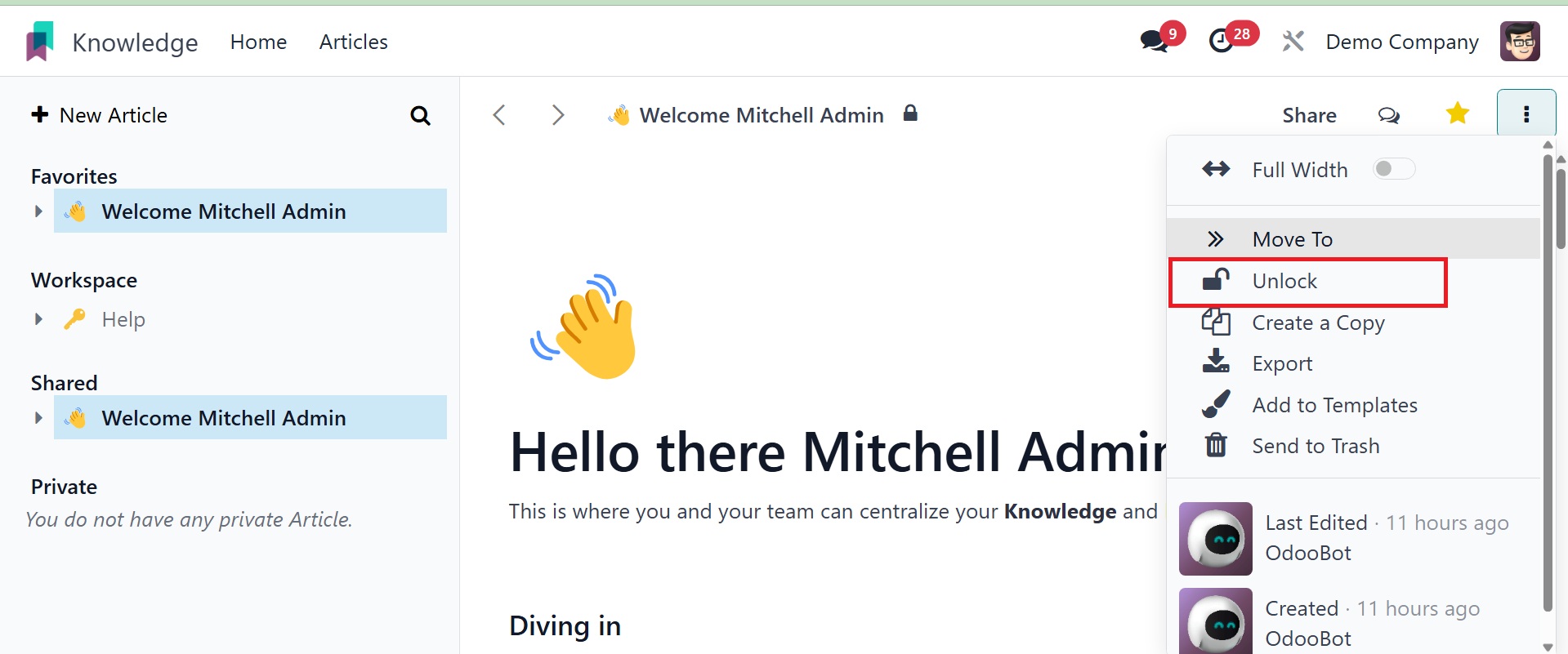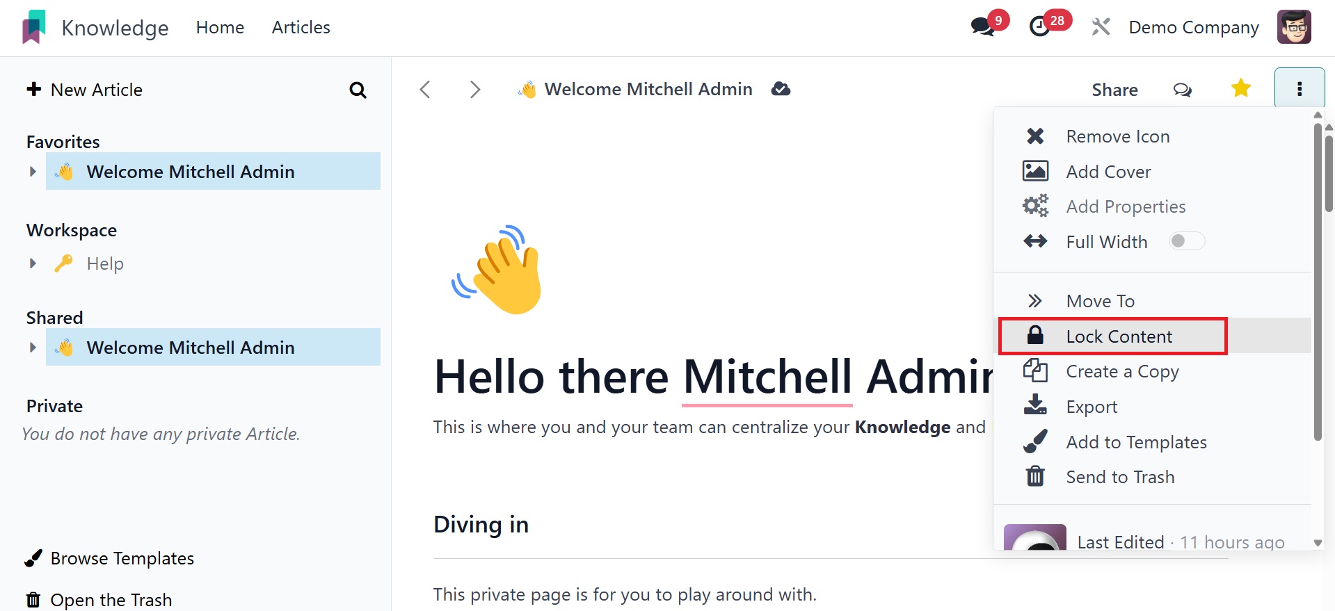Choose the Lock option to secure your content. Odoo18 will not allow