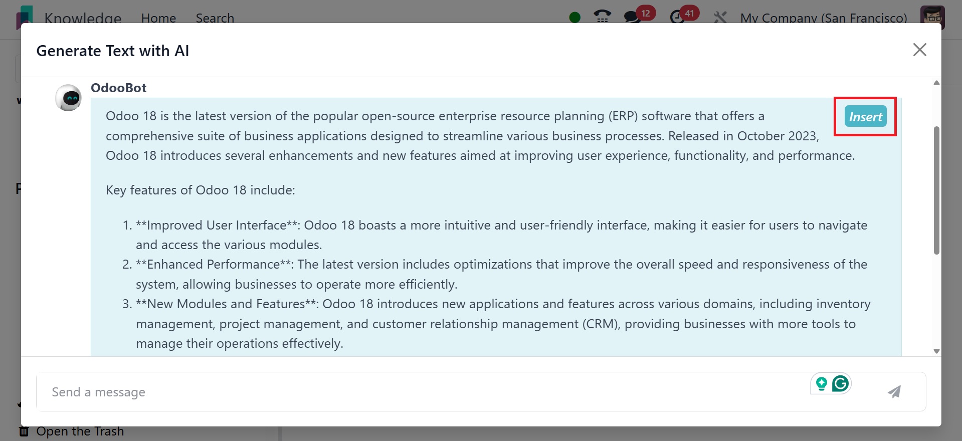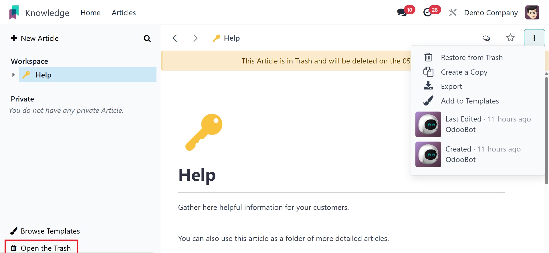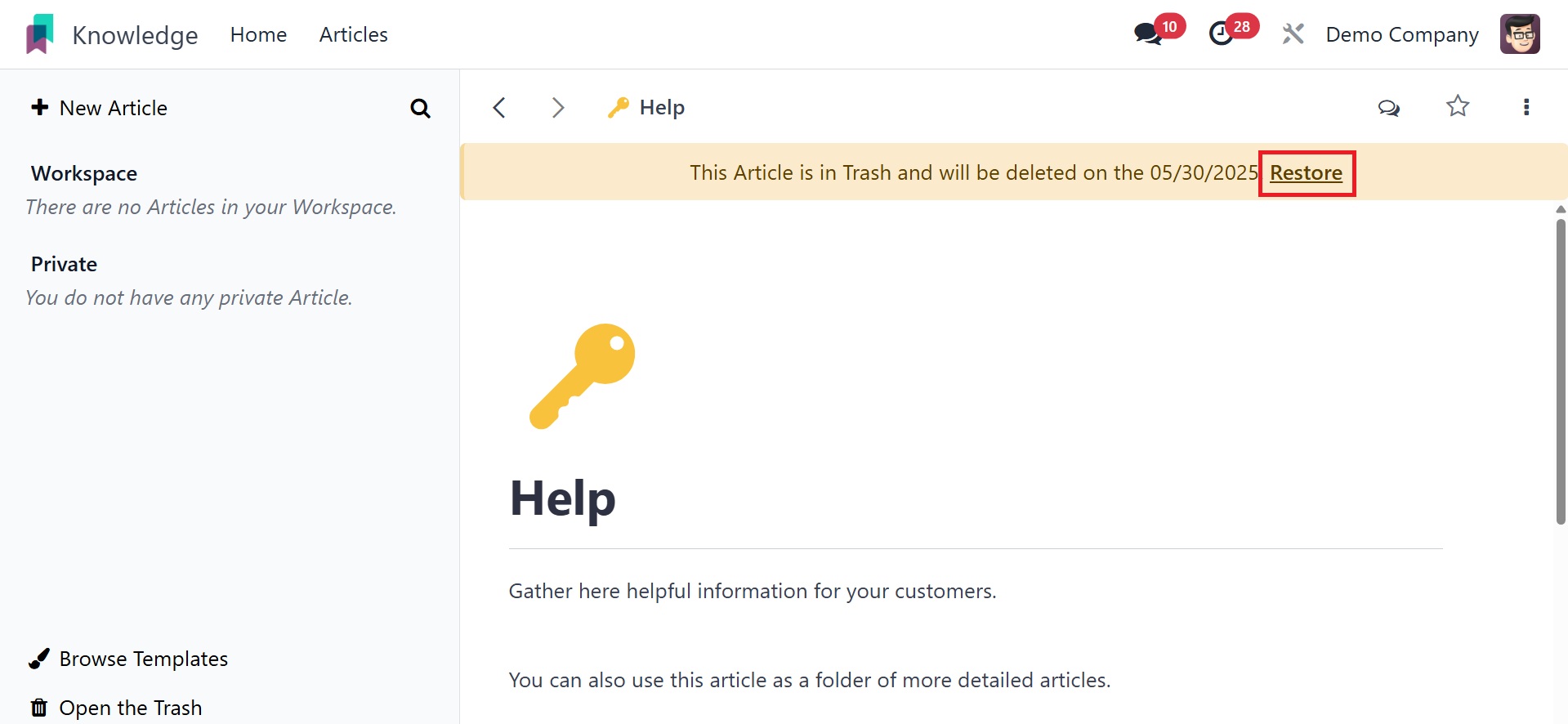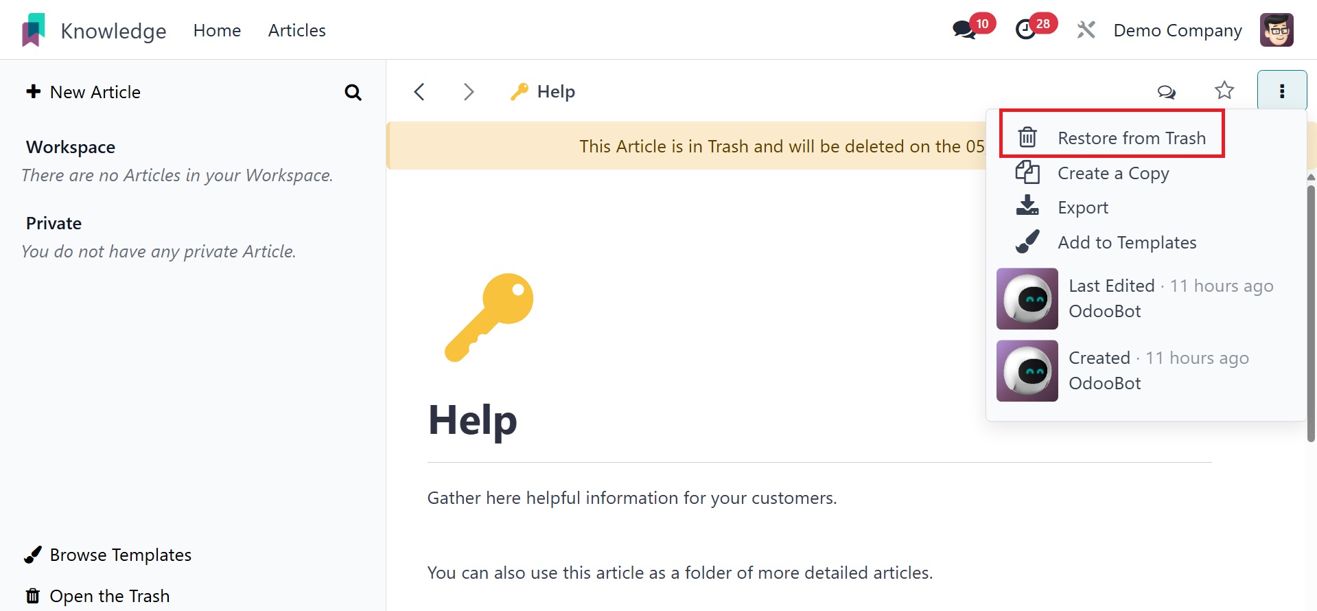The "Remove from Trash" option will cause Odoo18 to retrieve the