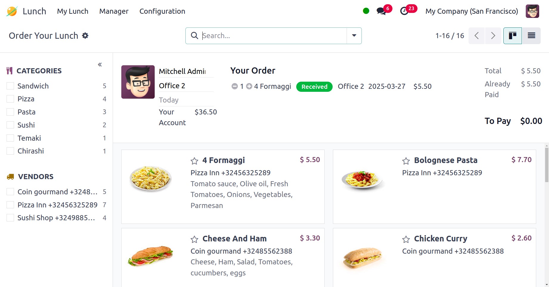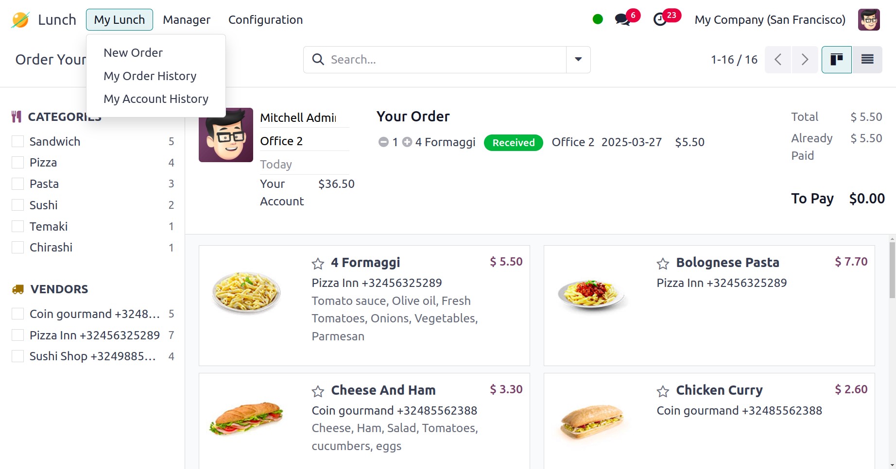 Under the My Lunch menu, you are provided with my order, my account,