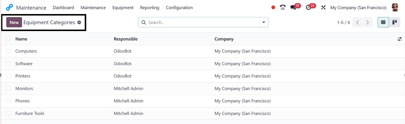 The Configuration Menu in the Odoo Maintenance module includes