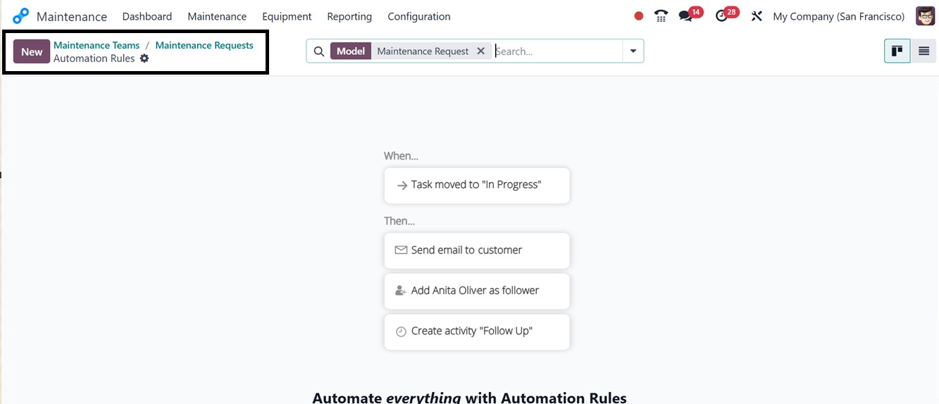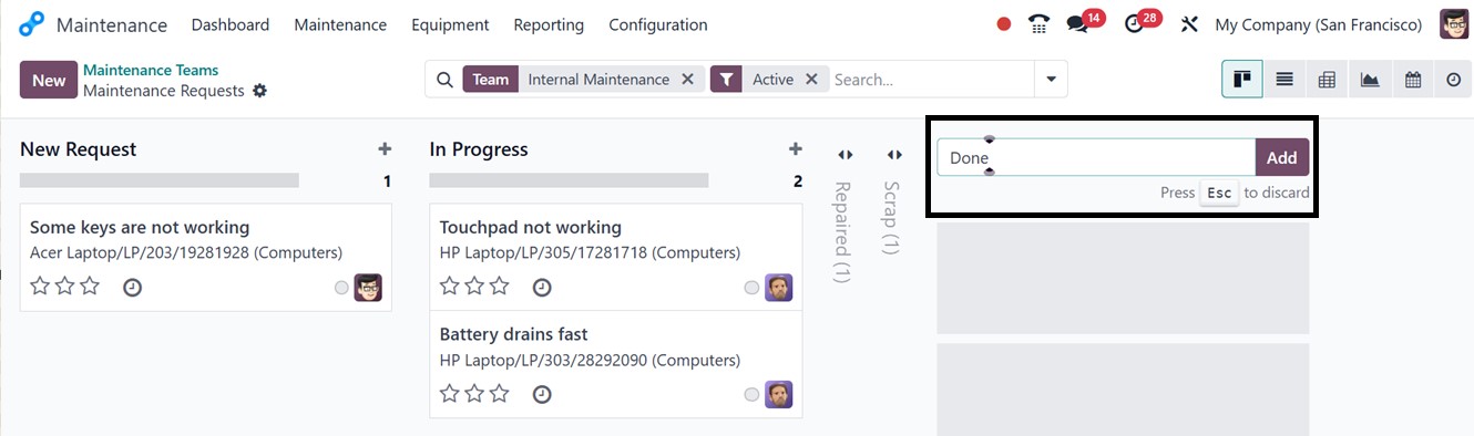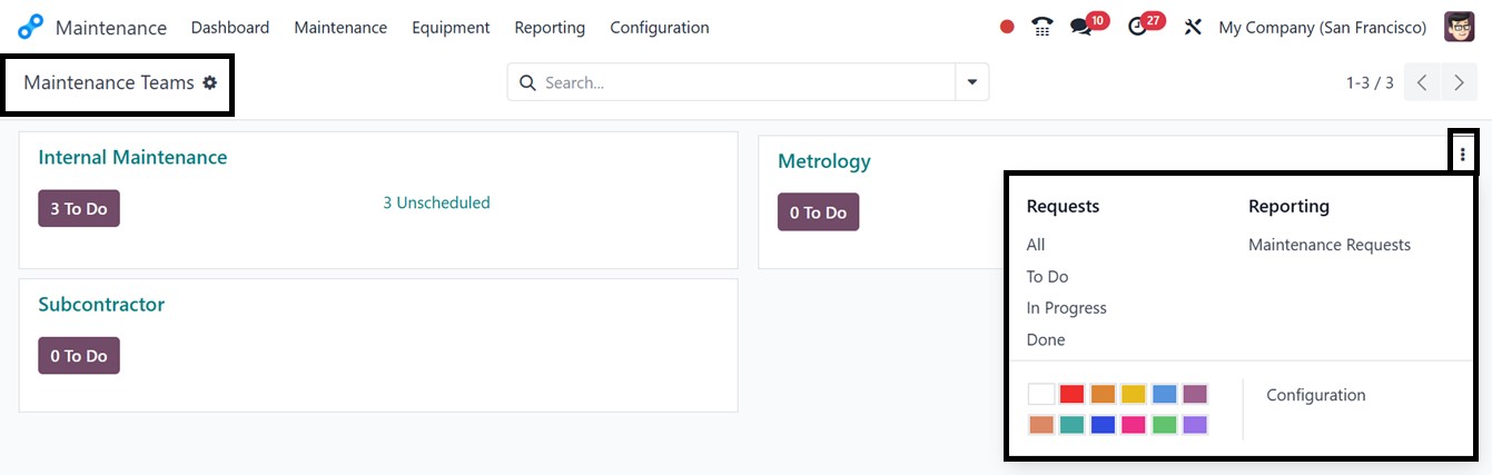 A Kanban-style dashboard that groups maintenance requests by teams,