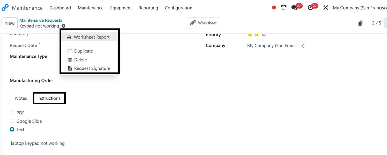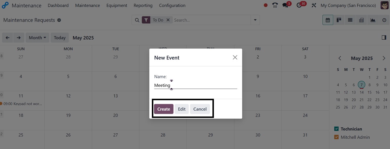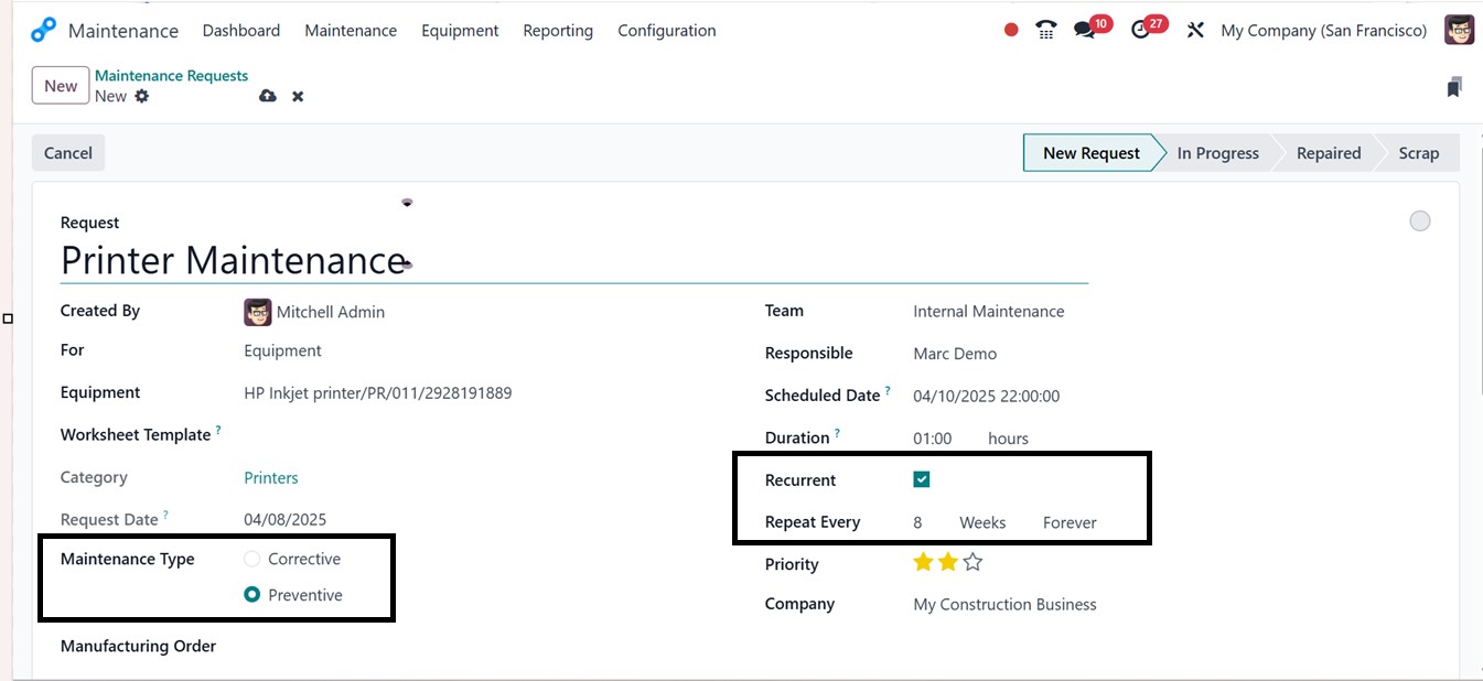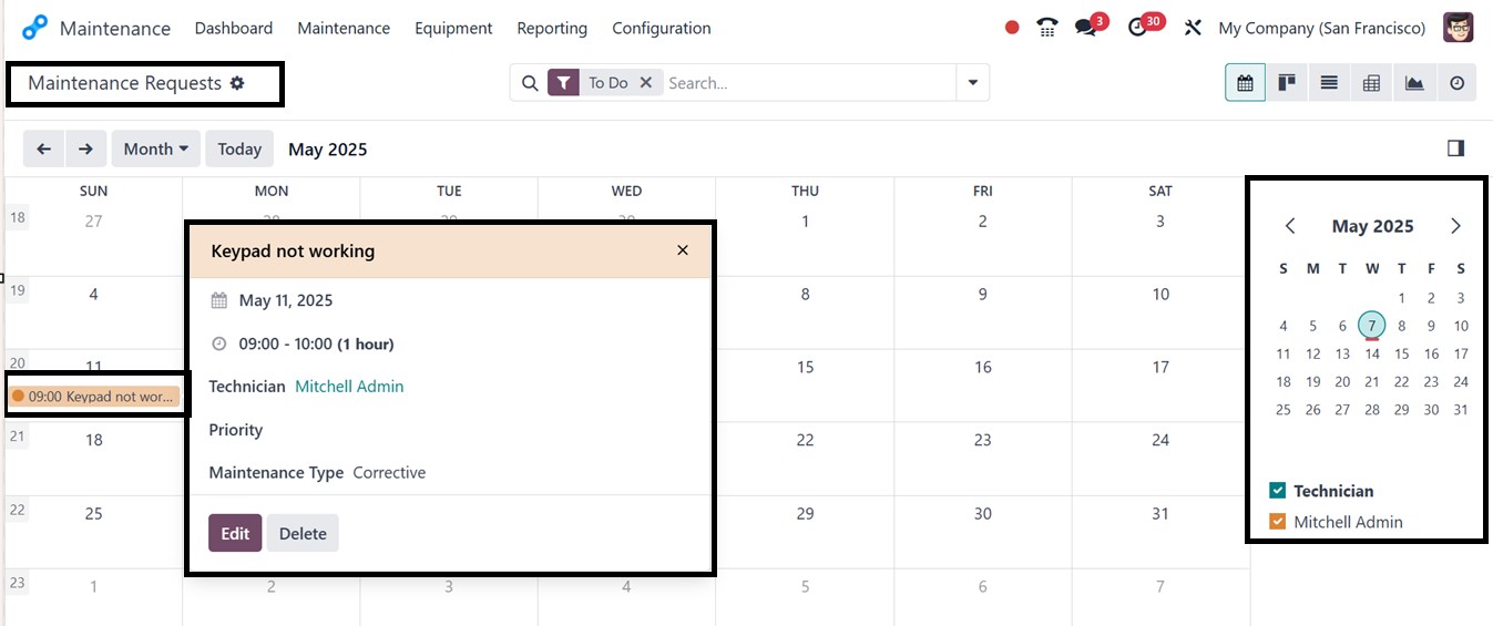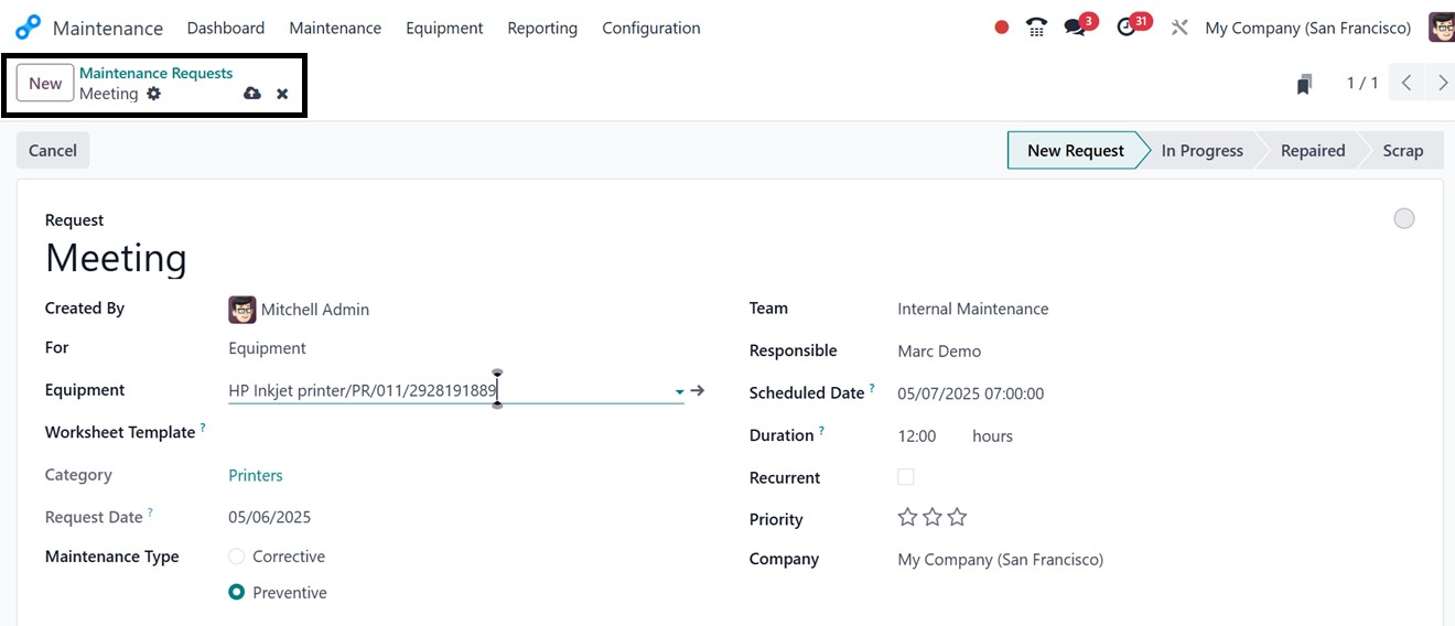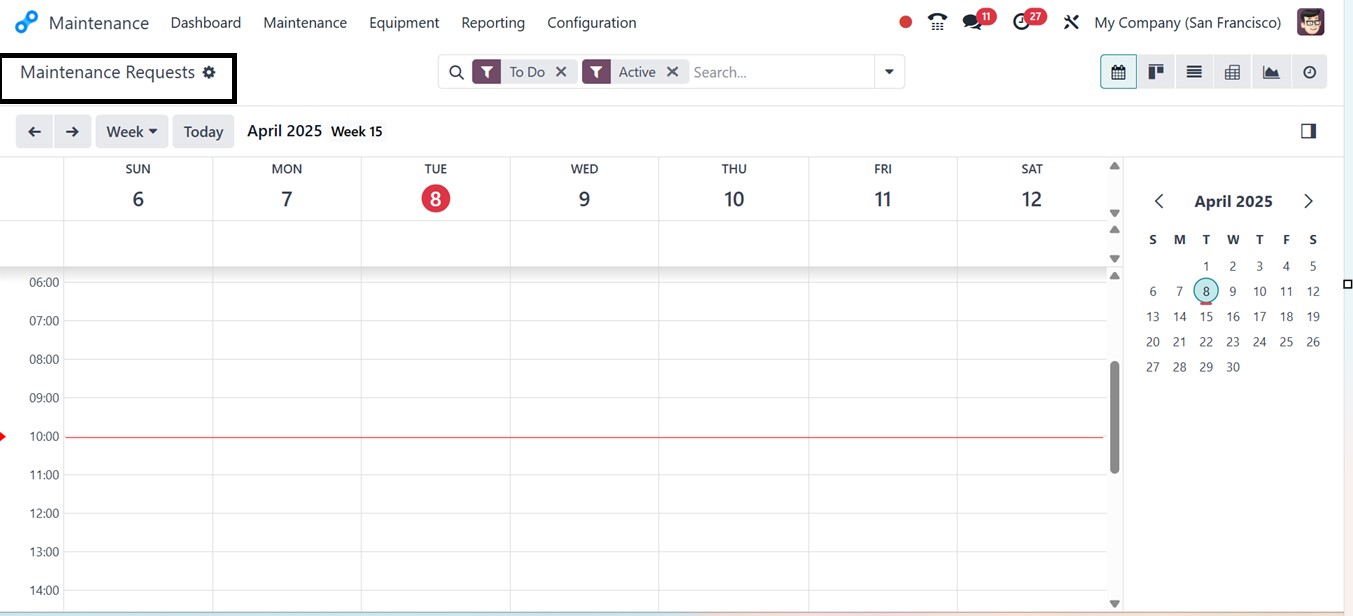 The ‘Maintenance’ Menu in Odoo 18's Maintenance module streamlines