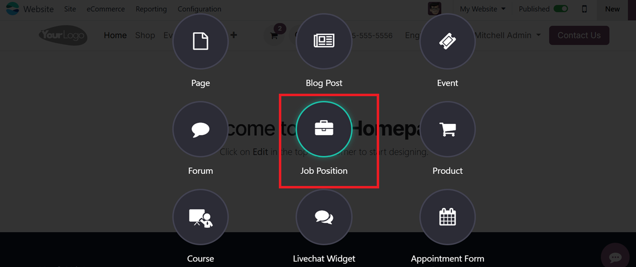 the Odoo website builder interface.