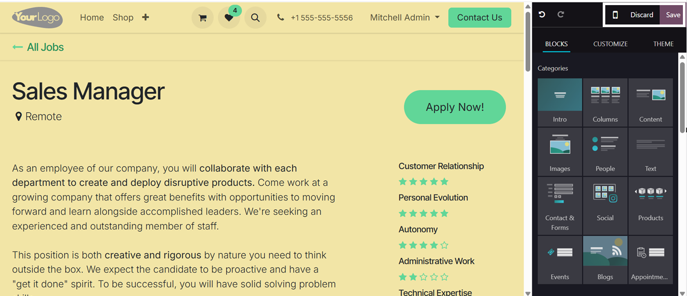 Odoo’s website builder offers users the flexibility to add detailed