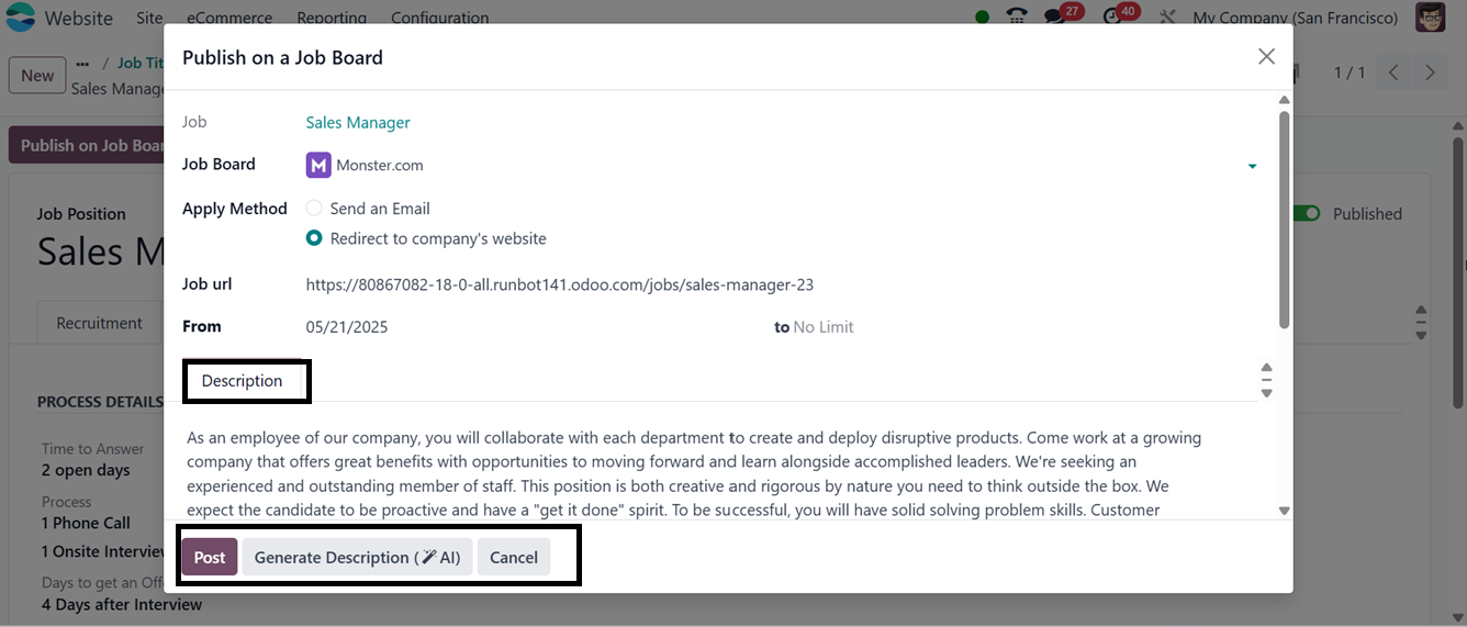 From the Odoo backend, you can manage a job posting's visibility by