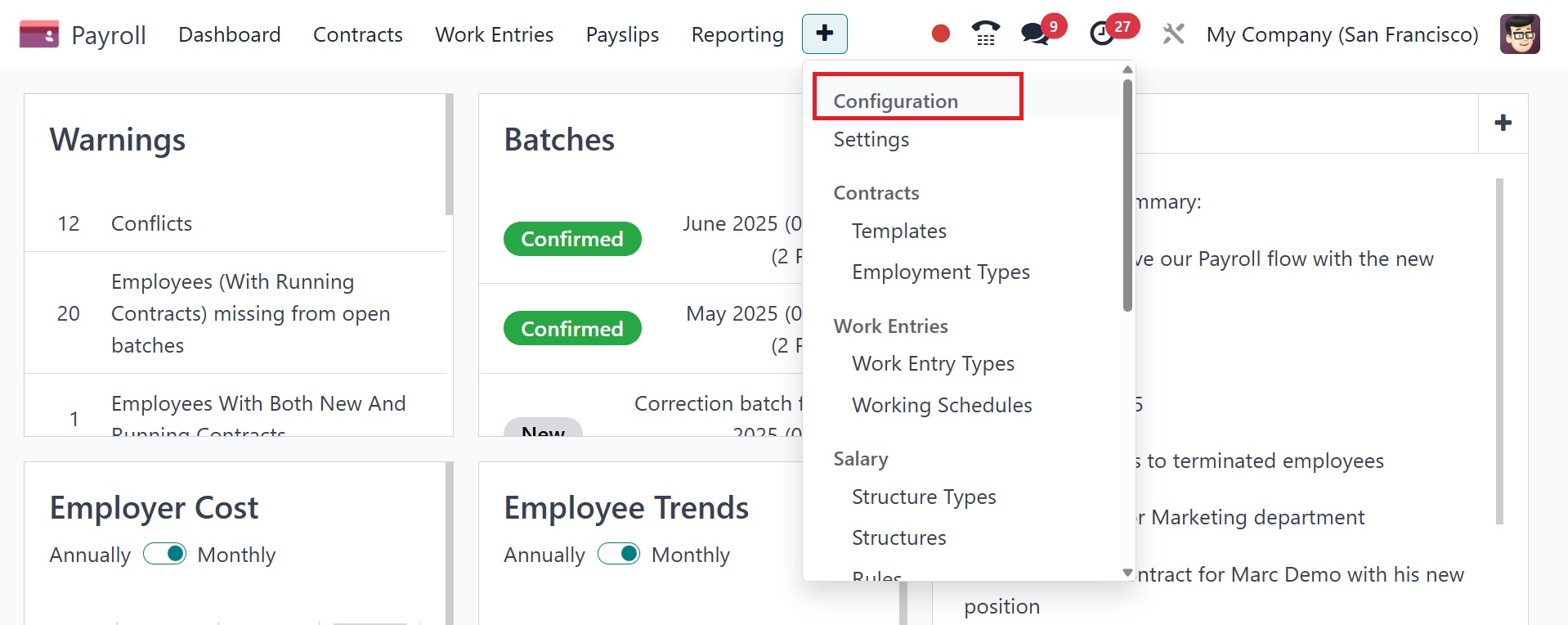 The Odoo 18 Payroll Module's "Configuration" menu opens the
