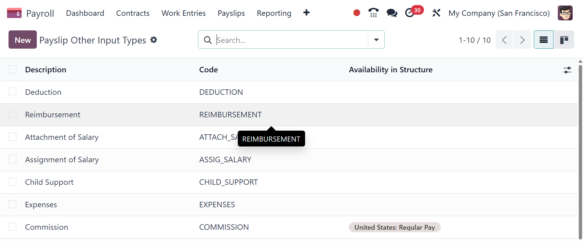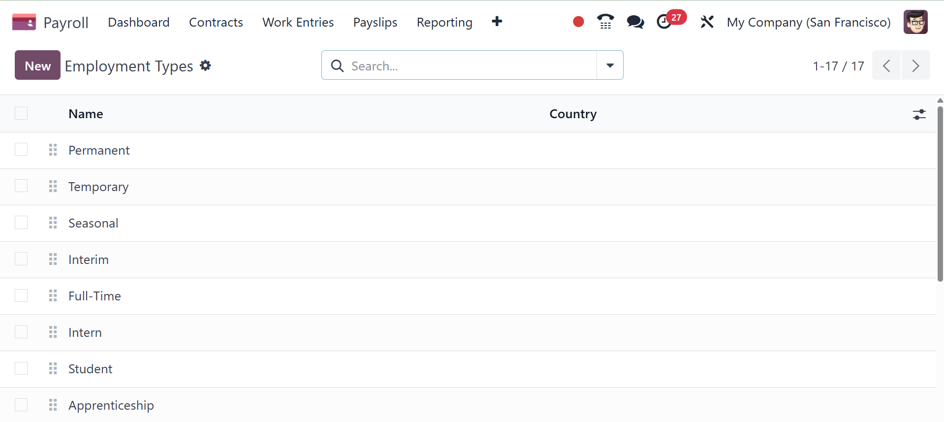 The Configuration menu now displays the list of work entry types. The