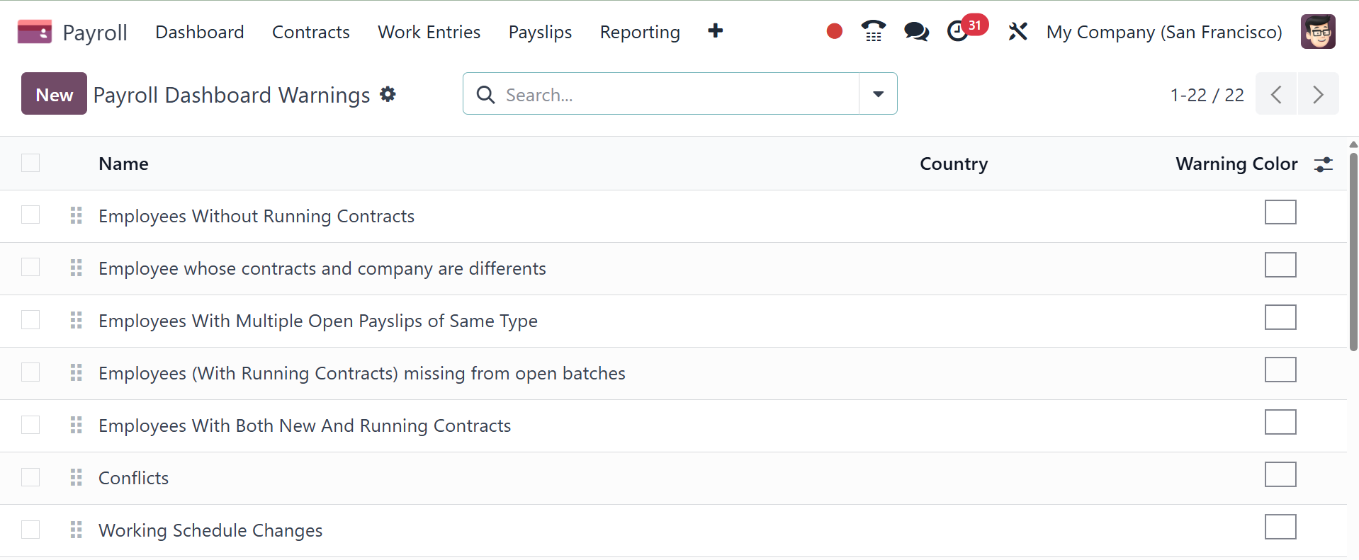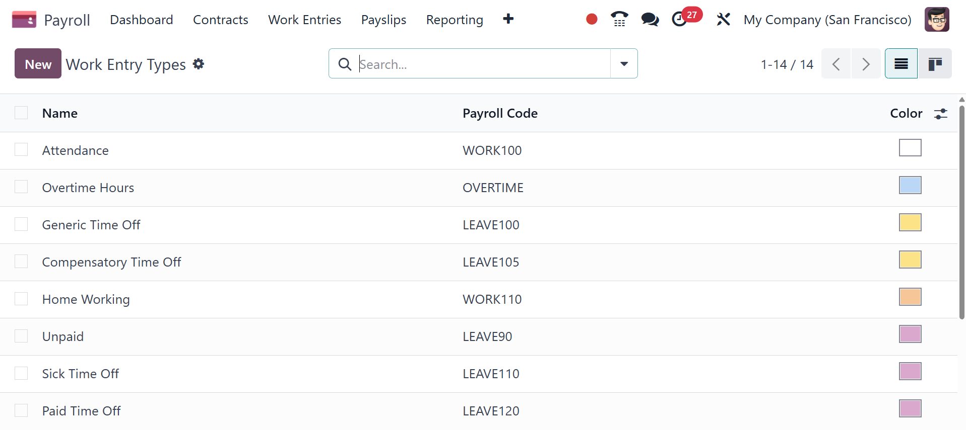 Name, Payroll Code, and Color are shown in the list. The New button