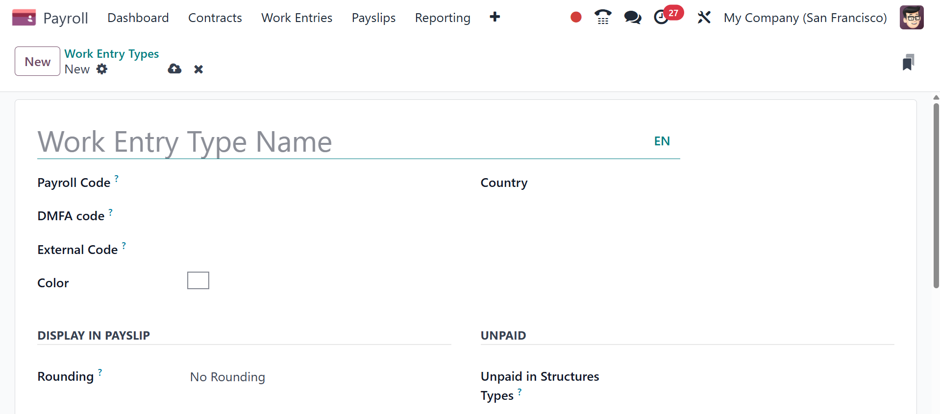 Enter the Workentry Type Name and Payroll Code. The DMFA Code is used