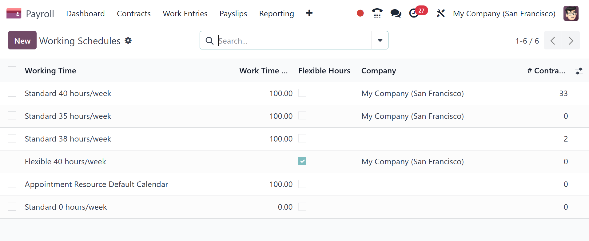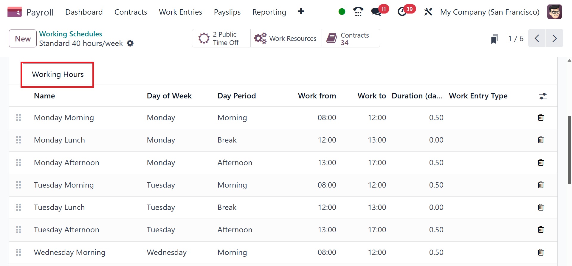 of Odoo 18 Payroll, select the Working Time menu. In the Working