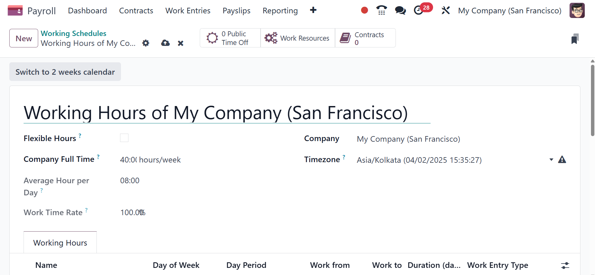 changes the Working Hours tab to display two weeks of working times