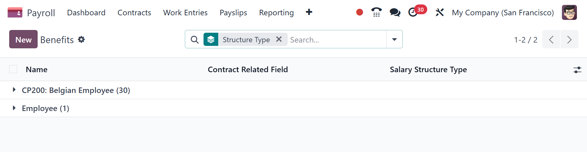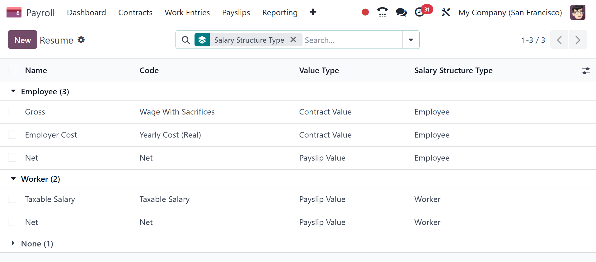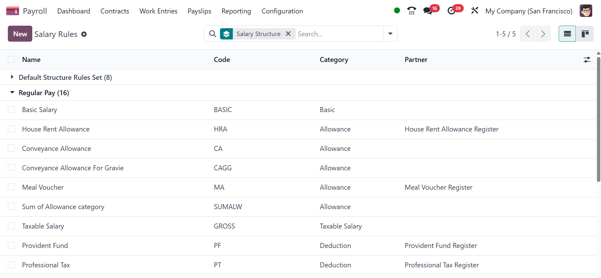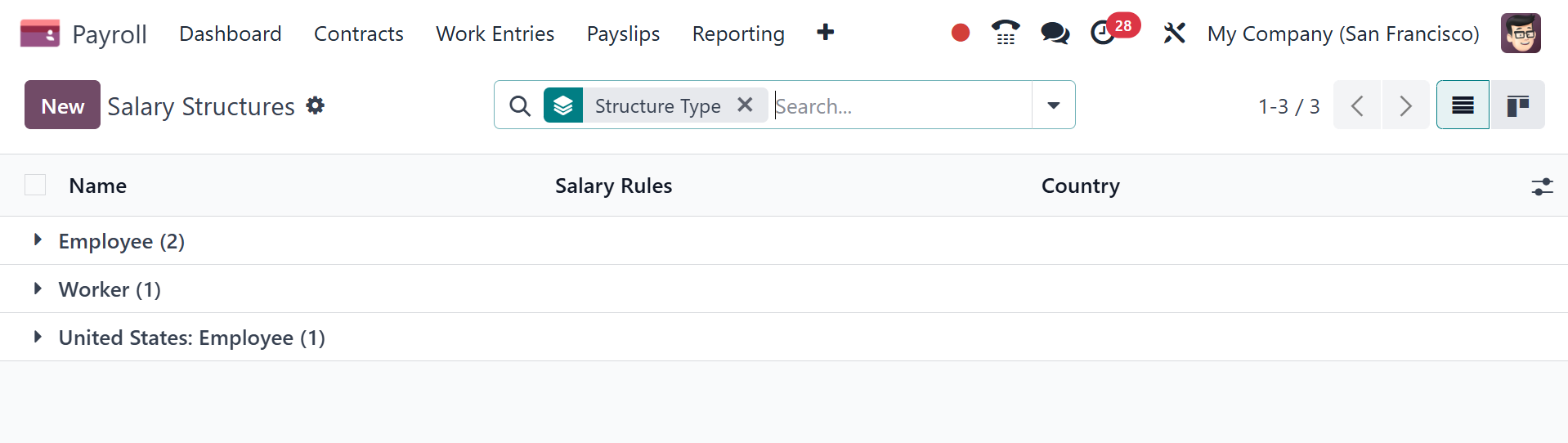 Salary Structures menu on the Configuration tab. The Structure Types
