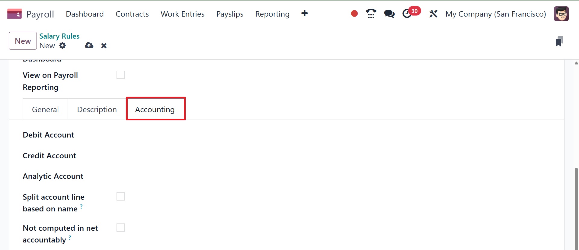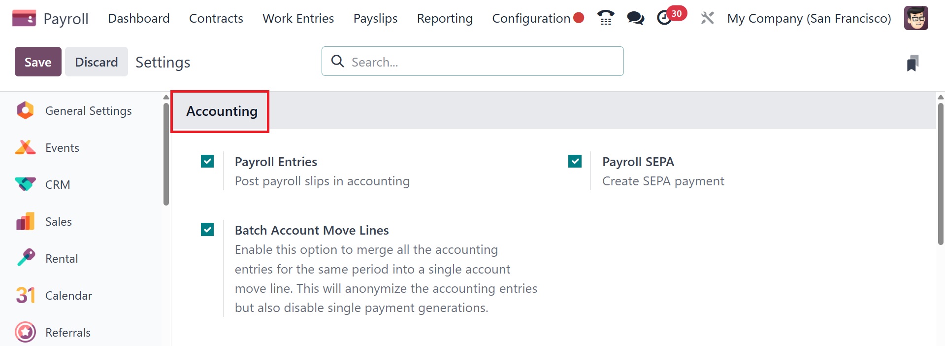 Accounting: under this option, we may configure the "Payroll Entries,