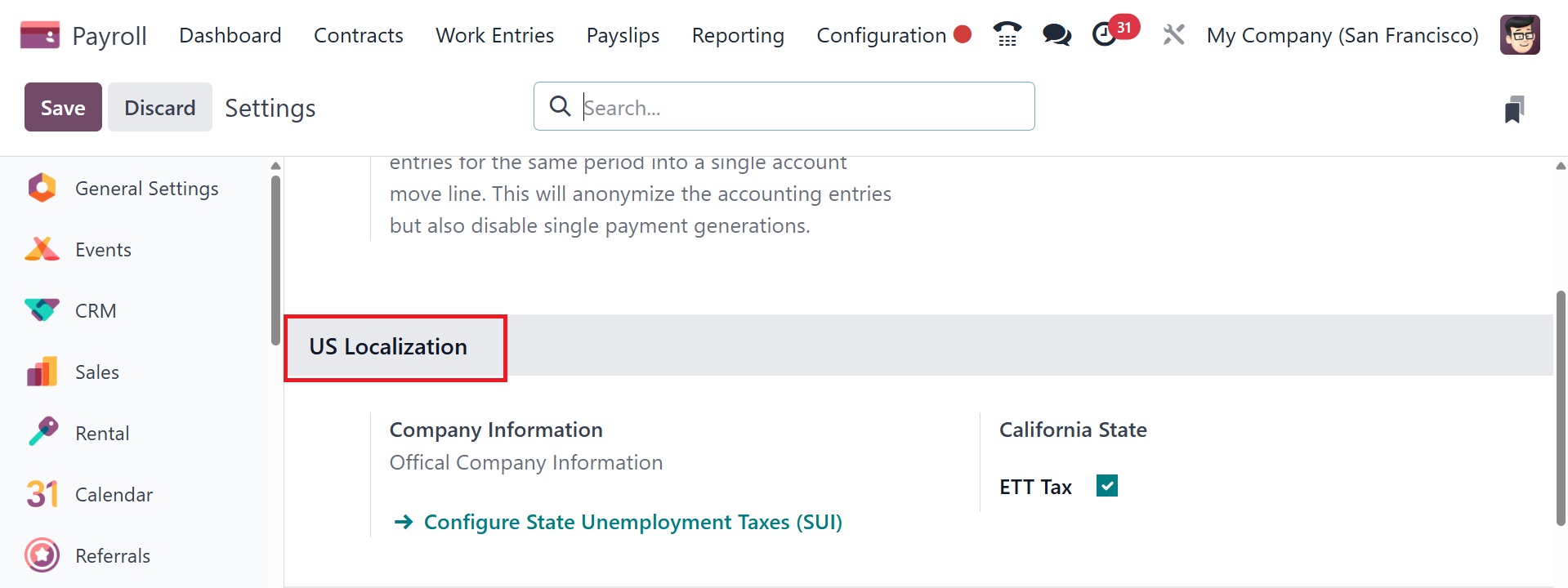 US Localization: From this settings page, we may activate the Belgian