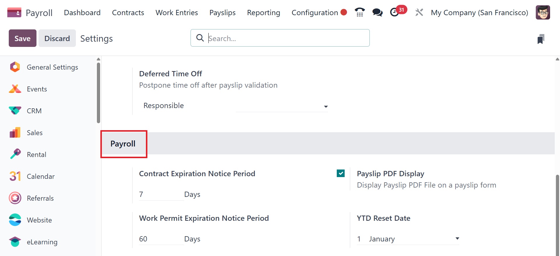 expiration notice period, and payslip PDF display option.