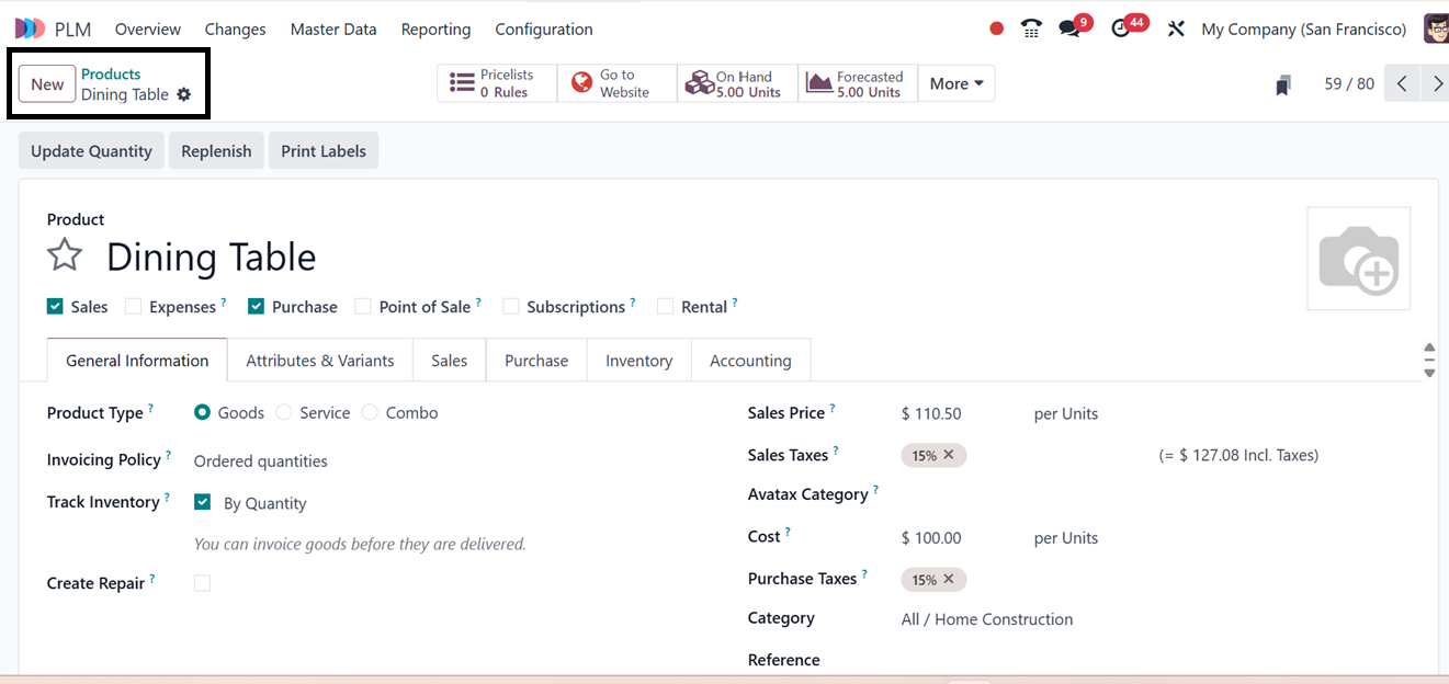 The Product Lifecycle Management (PLM) module of Odoo 18's Master
