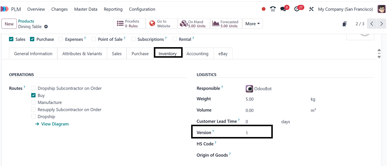 product's inventory data as well as on the BoM form in its ‘ECO(s)’