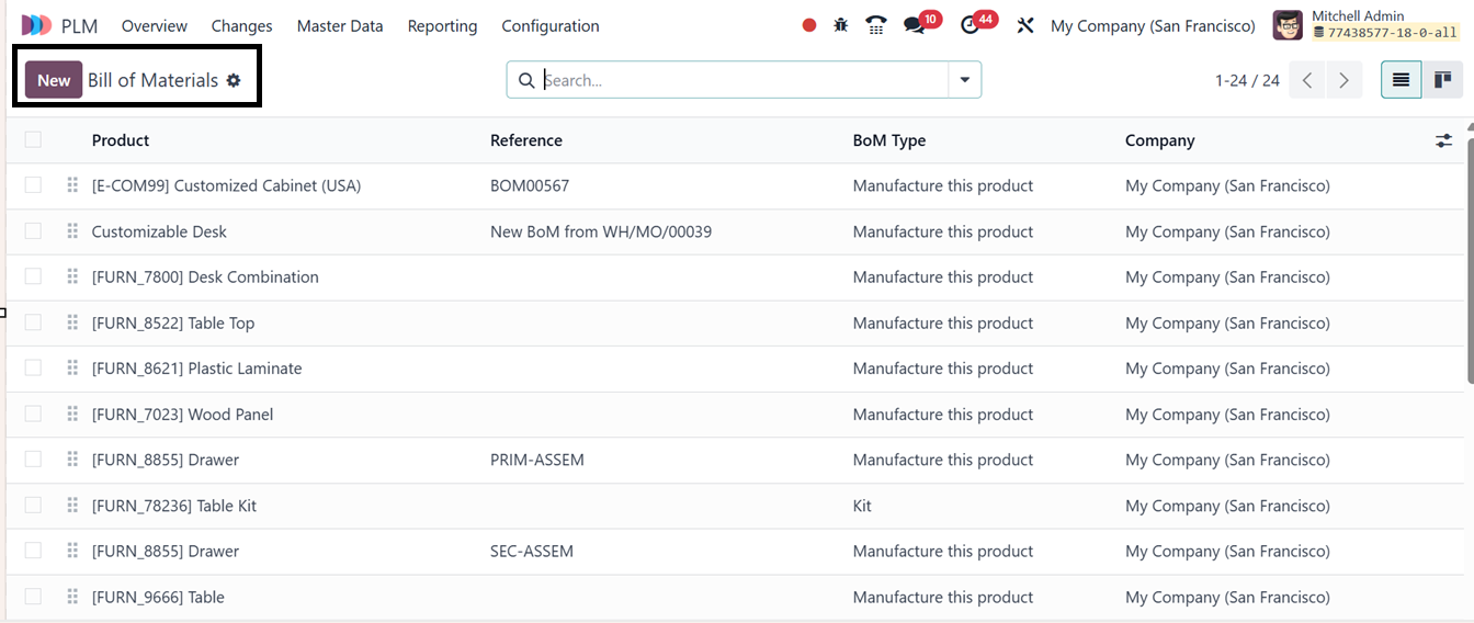 Click the New button to generate a new Bill of Materials (BoM) in