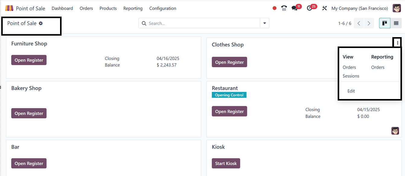 The vertical menu placed on each Point of sale session’s kanban card