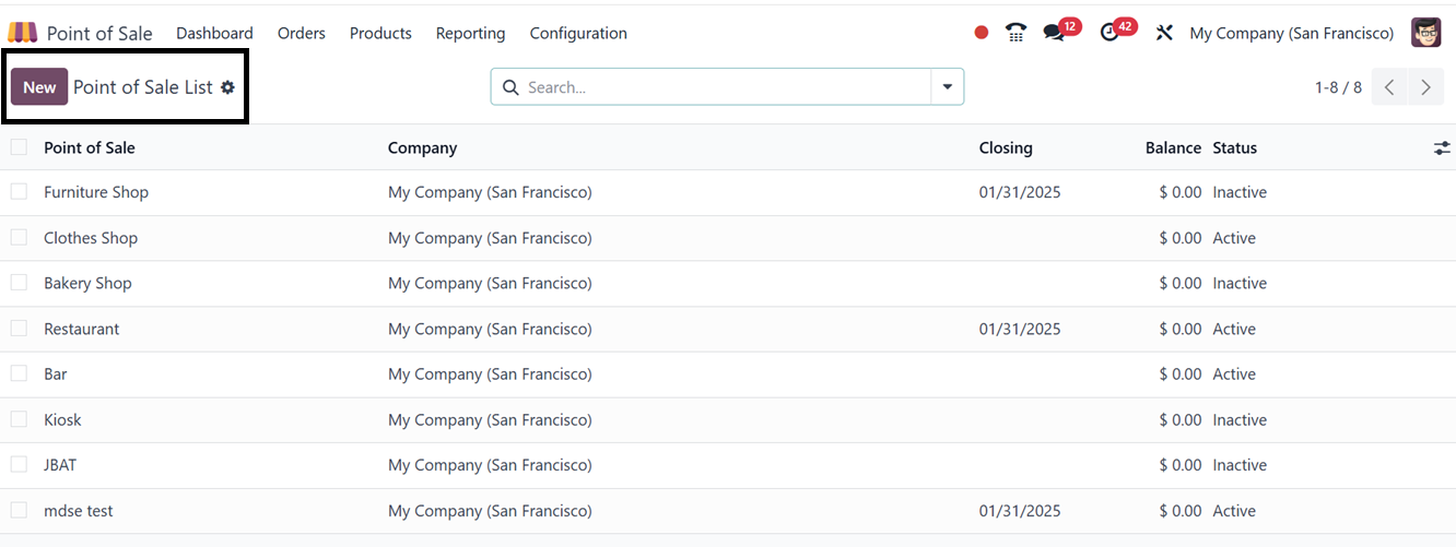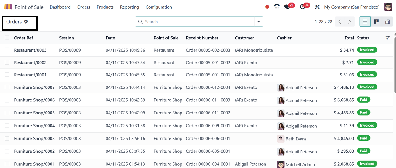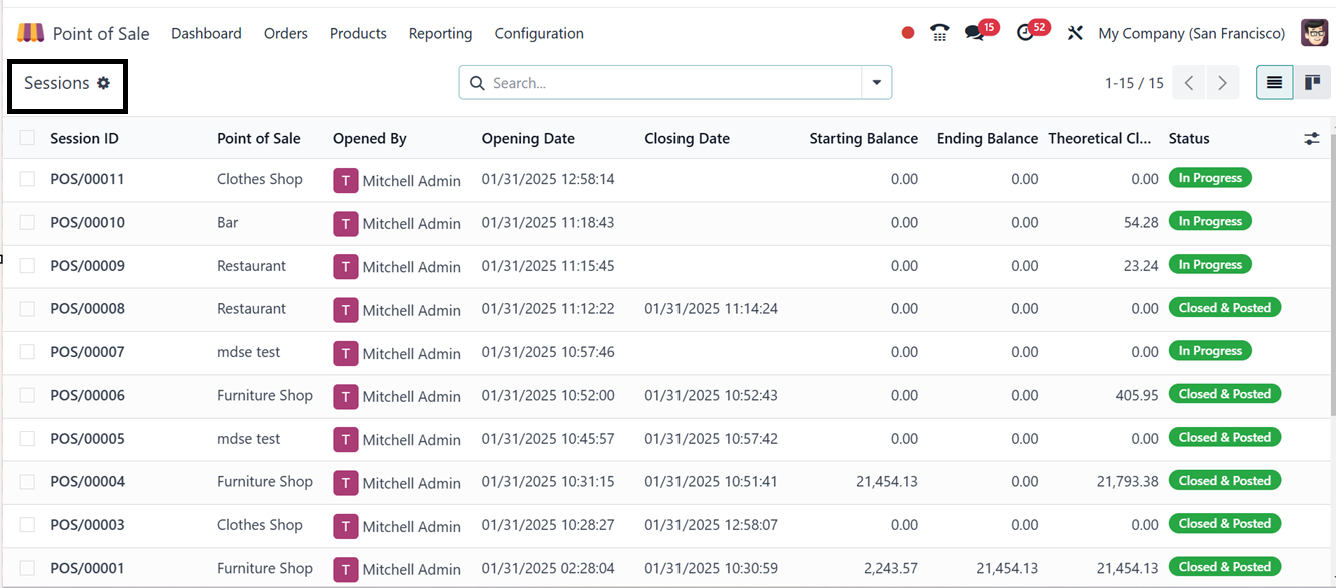 All active and completed sessions within the Point of Sale module can